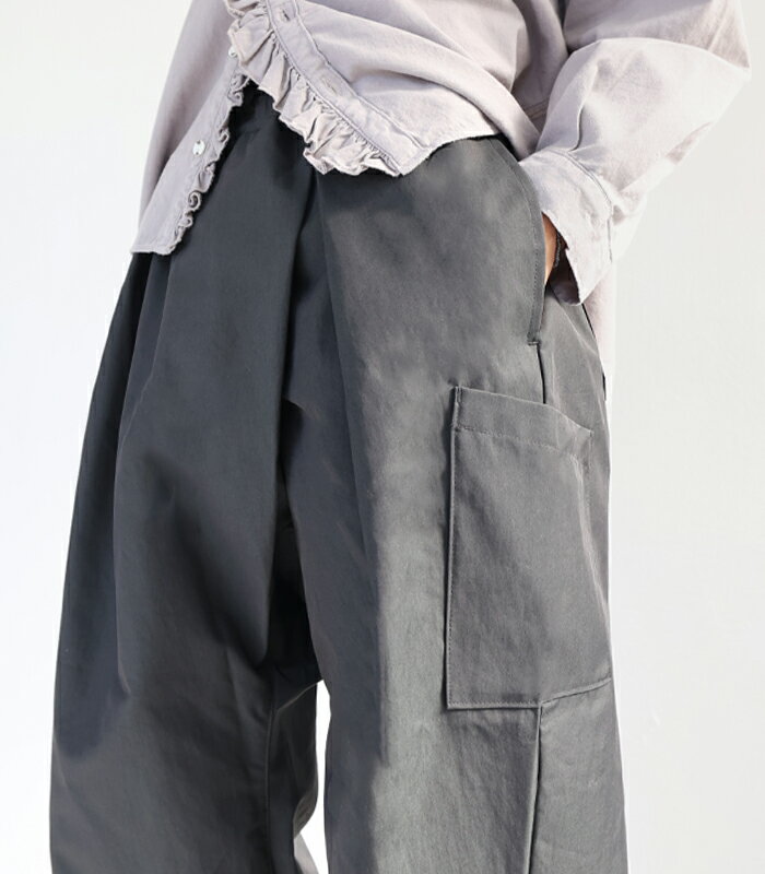 商品写真の色目はお使いのモニター設定・お部屋の照明やご覧いただく時間帯により異なる場合がございます。色の微妙な差が気になる方はご注文前に声をかけてください ■ 出荷について 営業日(月木金)に受注メール後、当店出荷致します ●月11時~木10:59迄ご注文→(木)出荷 ●木11時~金10:59迄ご注文→(金)出荷 ●金11時~月10:59迄ご注文→(月)出荷 ※前払い・クレジットエラーを除く ※祝日によっては営業日が変わります。当店カレンダーをご確認下さいMidiUmi[ミディウミ] Simple / Casual 着る人の内面が出るシンプルさ 着る人が何時も生き生きするカジュアルさ 気取らない大人の普段着 それがテーマです MidiUmi(ミディウミ)は フランス語で南方を意味する "Midi" 日本語の "海" からなる造語です -------------------------------- No:4-760030 color:チャコールグレー カーキ material:綿 ナイロン Made in Japan 日常を凛とさせる。新感覚ハカマライクパンツ タイパンツの知恵とカーゴの実用性|ハリが生む、優雅な立体シルエット ●タイパンツとカーゴ、二つの融合 デザインの源流は、タイの漁師の作業着であるタイパンツ。快適に過ごせるよう幅広で作るウエストラインの生地を折り畳むことで生まれる美しいドレープを、深いタックで表現。そこにカーゴパンツの実用的なポケットを融合させ、ただのリラックスパンツではない、特別な個性を生みだしています ●ワーク感と微光沢のバランス このパンツが持つ独特のワーク感は、この生地のハリから生まれています。高密度に織り上げられた生地は、シルエットを立体的に保ちつつ、タフな表情をプラス。それでいて、ほんのりと感じる微光沢が、無骨さを和らげ洗練された大人の印象を与えてくれます ●日常も特別な日も ワークパンツのカジュアルさと、ハカマのような凛とした風格。この絶妙なバランスが、穿く場所を選びません。スニーカーと合わせてアクティブな日常に、革靴と合わせて友人との食事に。どんなシーンでも、あなたらしさをそっとに主張してくれる一枚です タテ糸とヨコ糸が織りなすハリと微光沢凛とした佇まいをシーズンレスに タテ糸にはオーガニックコットンを、ヨコ糸にはリサイクルナイロンを使用し、高密度に織り上げた綾目素材です。コットンの持つ自然な風合いと、ナイロンの持つほのかな光沢感。二つの異なる糸が出会うことで、独特のハリ感と品格が生まれています この高密度なハリ感こそが、立体シルエットを一日中美しくキープする秘密。それでいて、タフすぎず、しなやかさも併せ持つコットンの快適さが、季節を問わず愛用できるシーズンレスな生地になっています こなれ感をつくるカーキ ワークウェアの定番色であるカーキも、このパンツならどこか洗練された表情に。ウエストを覗くドローコードには、あえて濃いミリタリーグリーンを採用。このさりげない色のコントラストが、デザイン全体をぐっと引き締め、大人の遊び心を添えています 白いシャツや上質なニットと合わせて、クリーンに着こなすのがおすすめです。黒のタートルネックでシックに引き締めても素敵。足元はレザーシューズやヒールで品格をプラスすると、このパンツが持つハカマライクな美しさが一層際立ちます 知性を感じるチャコールグレー 黒よりも柔らかく、グレーよりも深い。この絶妙なチャコールグレーは、ハカマライクな立体的なドレープを、とり美しく際立たせてくれます。ウエストを覗くドローコードには、シャープなブラックを採用。このシックな色のコントラストが、デザイン全体をモダンな印象に引き締め、洗練された雰囲気をプラスします 明るい白のブラウスや、淡いブルーのニットと合わせれば、クリーンで洗練された印象に。あえて黒のトップスでまとめた、シックなグラデーションの着こなしも素敵です。足元を選ばず、このパンツが持つ品格を引き立ててくれる万能色です タイパンツとカーゴパンツが融合したディテール ●タイパンツ由来のタック まず、このパンツの心臓部とも言えるのが、フロントから斜めに入る深いタック、そしてサイドに施されたタックです。特にフロントのタックは、タイパンツが「布を折り畳んで穿く」構造から着想を得たもの。これら複数のタックが、生地の重なりと美しい陰影を生み出し、ハカマのような凛とした立体感と、体型を拾わない極上のゆとりを実現しています ●カーゴパンツ由来の6つのポケット そして、カーゴパンツならではの大きめなパッチポケットを配置。左右後ろ合わせて6つのポケットが、ワークテイストな雰囲気を高め、デザインのアクセントになっています。実用性はもちろん、このポケットがあることで、単なるワイドパンツではない、遊び心を感じさせます 袴が表現する凛とした立体美 深いタックとハリのある生地が生む、ハカマのように凛としたワイドシルエット。股上が深く、腰回りやヒップラインをふわりと包み込む、計算されたゆとりが魅力です そのまま履くの
