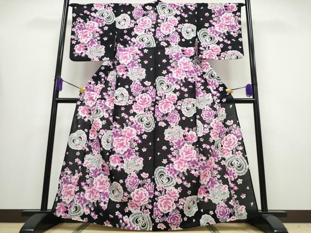 平和屋着物∴夏物 浴衣 レースハート 牡丹花文 黒地 綿 逸品 CABA0644ng