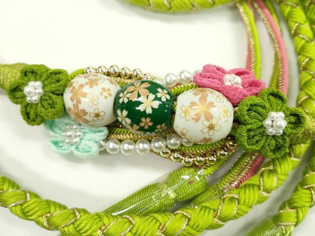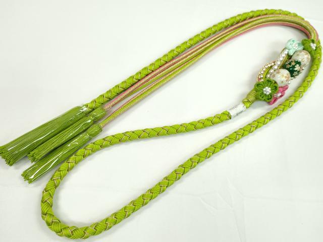 平和屋着物●和装小物 振袖用帯締め 飾り付き つまみ細工 飾り玉 パール 萌黄色 金糸 撚り房 逸品 未使用 CABC0990ju