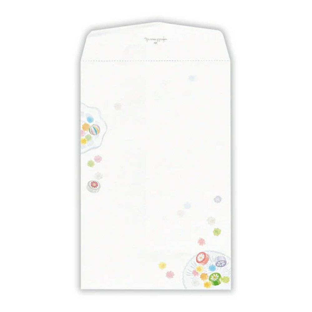 特徴:和モチーフのデザインがにぎやか♪和風の便箋用封筒です。 色とりどりの飴やこんぺいとうなどの和菓子のモチーフをあしらったデザインです。 ●175×115mm ●2柄4枚 ●ハガキが入る大きさです。