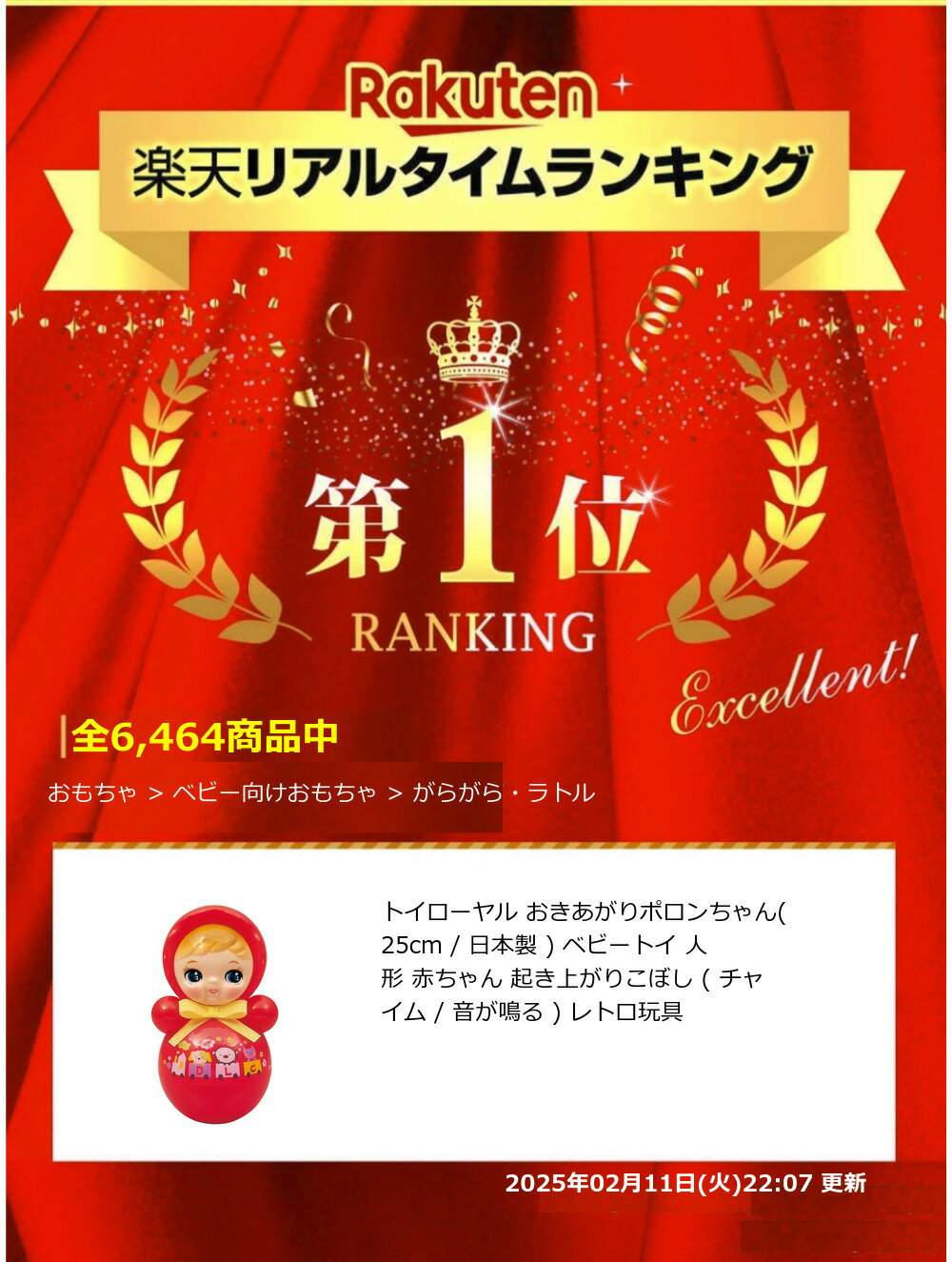商品情報商品の説明説明 商品紹介 【日本製のおきあがりポロンちゃん】 ひとつずつ職人さんが手作りした日本製のおきあがりこぼしです。 軽く触れるだけでゆらゆらと揺れながら、レトロさを感じる癒しのやさしい音色が響きます。 【今も昔もきれいな音色】 きれいな音色が赤ちゃんにやさしく響きます。 チャイムのチューニングや人形の組み立ては一つ一つ手作業で、心地よい音色になるよう揺れ方まで調整したこだわりのアイテムです。 【出産祝いやプレゼントに】 今も昔も変わらないきれいな音色のポロンちゃん。 お子様やお孫様、お友達や親戚、お世話になった方への出産祝いや誕生日プレゼント、ギフト、贈り物にもおすすめです。 【注意事項】 ※サイズごとに表情が異なります。 ※色は選べません。 【商品詳細】 サイズ:25cm 対象年齢:0ヶ月から 安全警告 STマーク主な仕様 トイローヤルの正規品(新品・未開封)は販売元【.co.jp】のみで販売しております。公式店以外でご購入いただいた商品のご返品等の対応は致しかねます。br【日本製のおきあがりポロンちゃん】1つずつ職人さんが手作りした日本製のおきあがりこぼしです。軽く触れるだけでゆらゆらと揺れながら、レトロさを感じる癒しのやさしい音色が響きます。チャイムのチューニングや人形の組み立ては一つ一つ手作業で、心地よい音色になるよう揺れ方まで調整したこだわりのアイテムです。br【出産祝いやプレゼントに】今も昔も変わらないきれいな音色のポロンちゃん。お子様やお孫様、お友達や親戚、お世話になった方への出産祝いや誕生日プレゼント、ギフト、贈り物にもおすすめです。br【注意事項】※サイズごとに表情が異なります。※色は選べません。br【商品詳細】サイズ:25cm / 安全基準:STマーク/対象年齢:0ヶ月以上【STマークについて】Safety Toy(安全な玩具)を表し、検査機関の検査で、一般社団法人日本玩具協会の玩具安全(ST)基準に合格した玩具に表示できるもので、「安全面について注意深く作られたおもちゃ」として玩具業界が推奨するものです。
