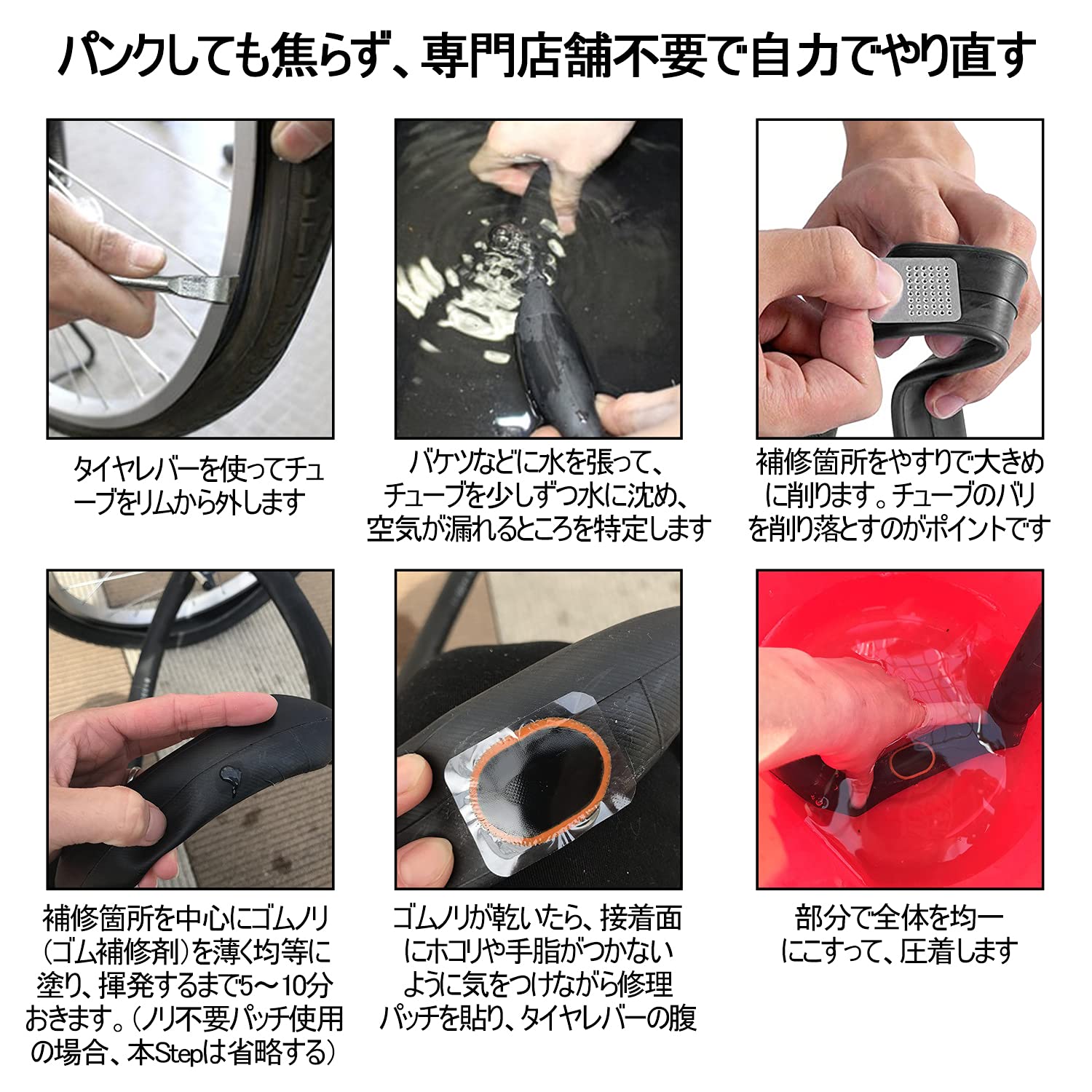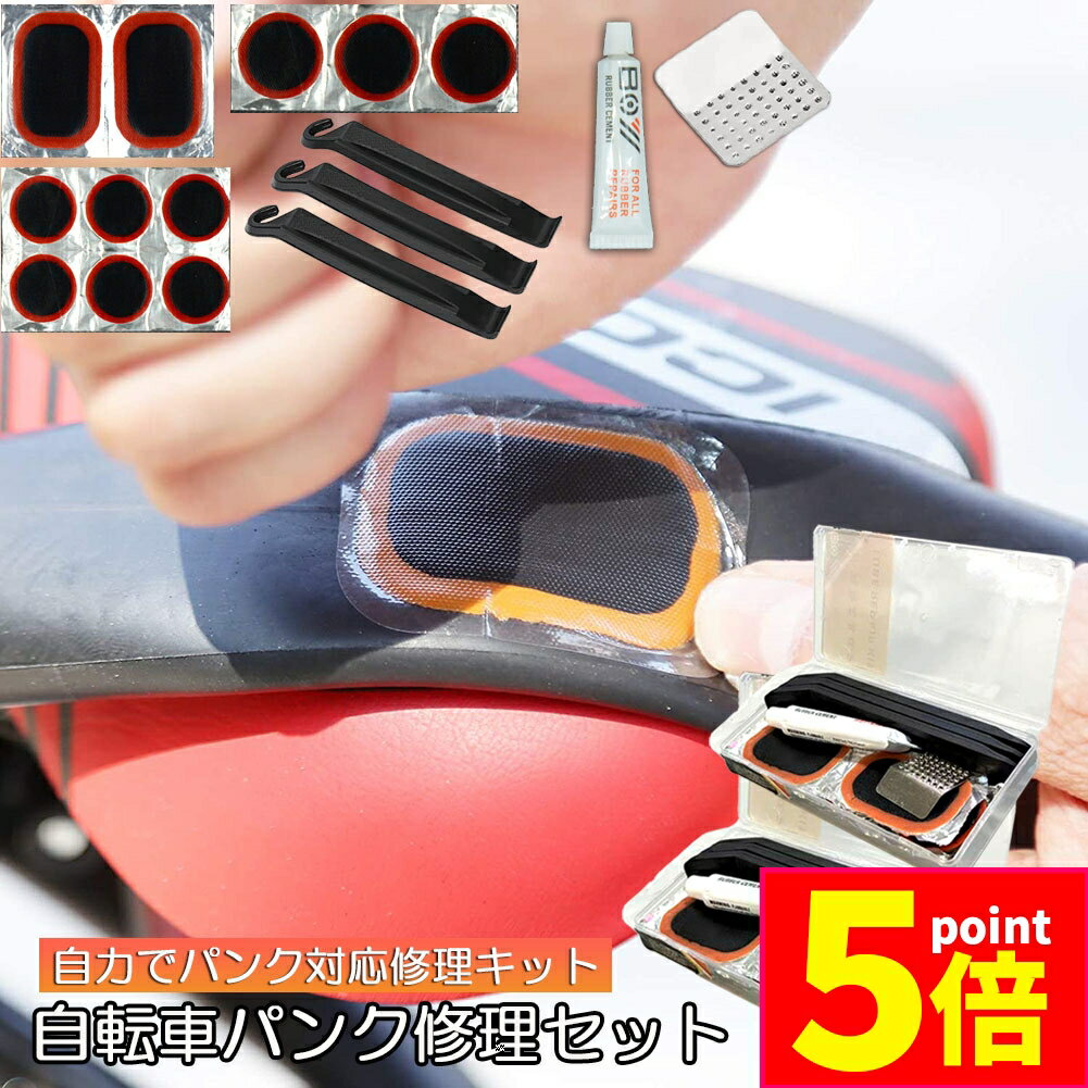 商品情報商品の説明主な仕様 【説明】突然パンクの困りをなくす、自転車屋さんまで押して行かなくても自力でパンク対応修理キットです。使い方も簡単で応急修理にお勧めさせて頂きます。br【仕様】合計25点セット タイヤレバー*3 接着タイプパッチ*11 ノリ不要タイプパッチ*6 やすり*4 接着剤*1br【特徴】耐久性を向上のスチール製タイヤレバー*3本付属、やすりもスチール製で繰り返し使用可能です。パッチは4サイズ仕様で合計17枚も入っております。br【使い方】日本語取説付属しておりませんが、写真3枚目をご参照頂くか、検索エンジンで自転車パンク修理をご参照頂ければ、簡単に自力でパンク修理できます。