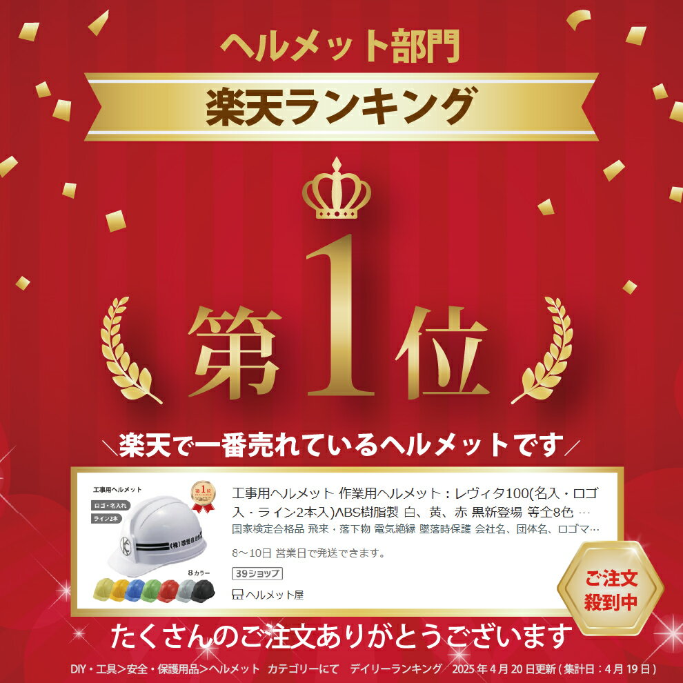 【 ランキング1位 】 工事用ヘルメット 作業用ヘルメット:レヴィタ100(名入・ロゴ入・ライン2本入)全8カラー 安心安全の国家検定合格品