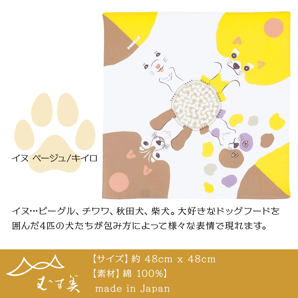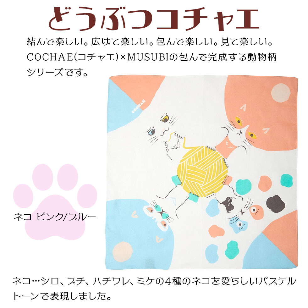 ITEM DATA 結んで楽しい。広げて楽しい。包んで楽しい。見て楽しい。COCHAE(コチャエ)×MUSUBIの包んで完成する動物柄シリーズです。 【デザイン】 ネコ…シロ、ブチ、ハチワレ、ミケの4種のネコを愛らしいパステルトーンで表現しました。 イヌ…ビーグル、チワワ、秋田犬、柴犬。大好きなドッグフードを囲んだ4匹の犬たちが包み方によって様々な表情で現れます。 【風合い】 ガーゼ生地を使用しているため、手触りよく吸水性にも優れています。 【用途】お弁当包み、ギフトラッピング 【製品寸法】 約 48cm x 48cm 【素材】コットン100% 【日本製】 INFOMATION 【メール便対応商品】
