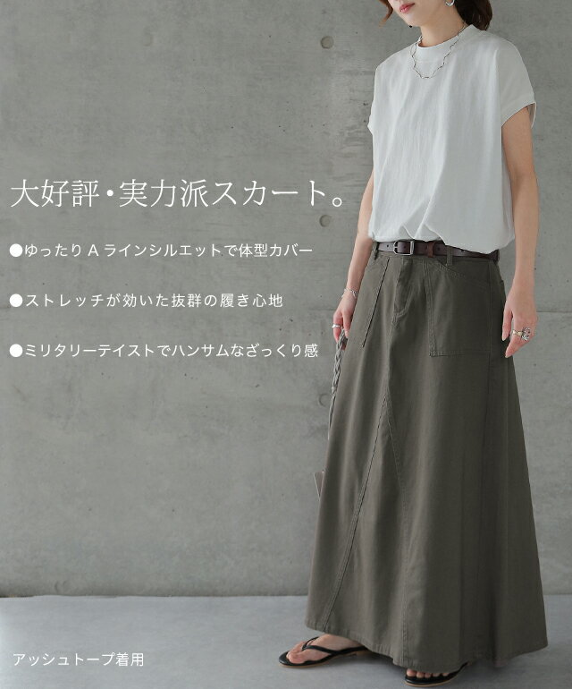 スカート ロングスカート マキシスカート ベイカースカート ロング マキシ ベイカー 大きいサイズ 体型カバー Aライン フレア フレアスカート チノ ストレッチ 着痩せ ミリタリー ボトム ゆったり 伸縮 黒 白 カーキ 春 冬 HUG.U