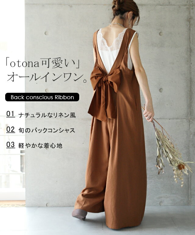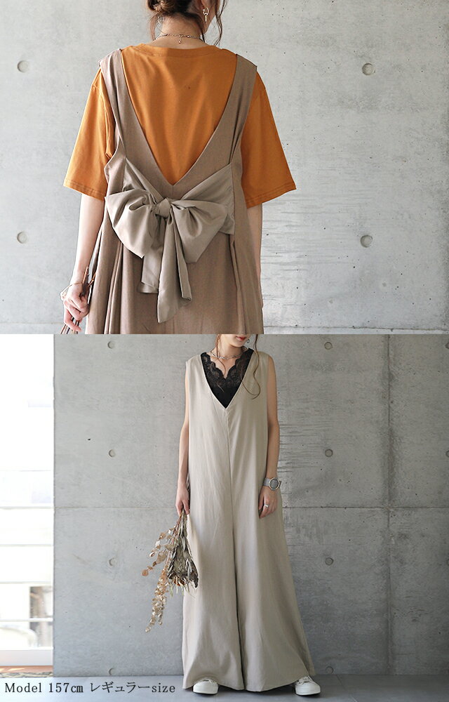 オールインワン レディース サロペット サロペ オーバーオール 体型カバー リボン バックリボン 後ろリボン 大きいサイズ フリーサイズ ワイドパンツ ワイド ワンピース パンツ ワンピ つなぎ ズボン ベージュ 黒 グレー 春 冬 HUG.U