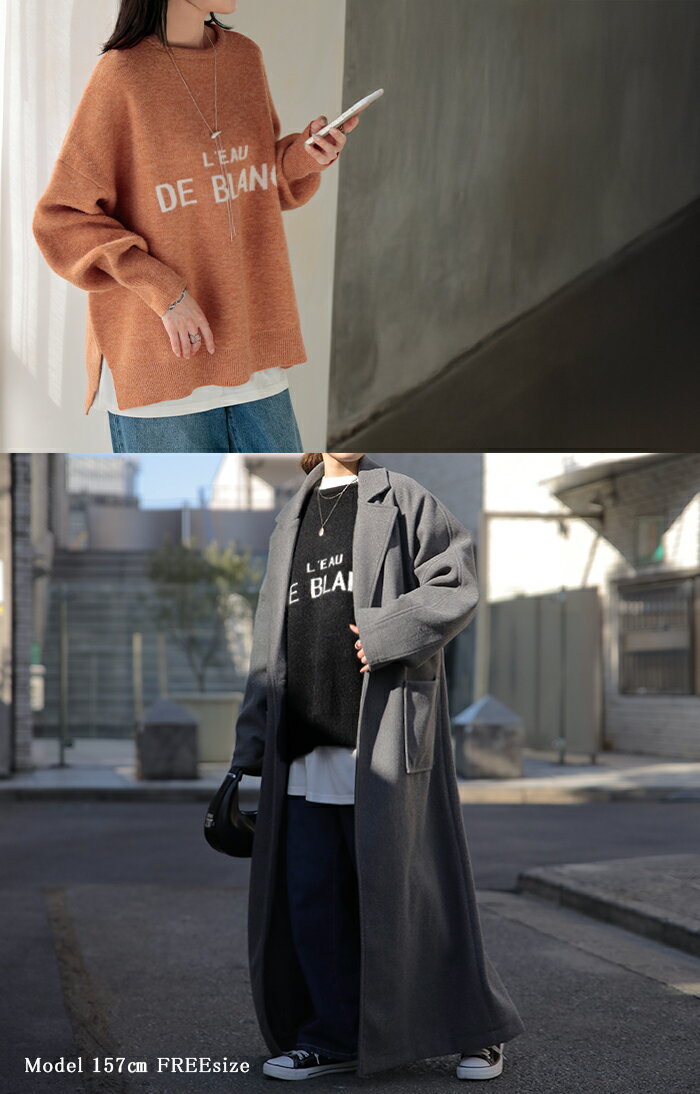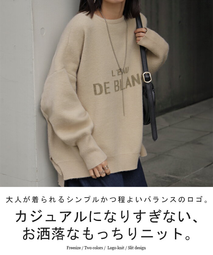 SNS映え確定。「 おしゃロゴ 」ニット ロゴ ロゴニット 体型カバー 大人 クルーネック プルオーバー レディース セーター トップス スリット 長袖 丸首 レイヤード チュニック お尻が隠れる ゆったり 長め ジャガード リブ ブラック 青 秋 冬 HUG.U
