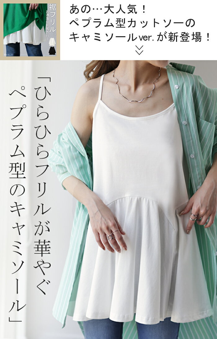 長さ 調節可能。お尻を隠す 裾フリル キャミ ペプラム フリル キャミソール レイヤード 裾 ロング お尻が隠れる レイヤードキャミソール レディース 重ね着 トップス 無地 バックフリル 体型カバー 大きいサイズ 付け裾 黒 白 春 夏 HUG.U