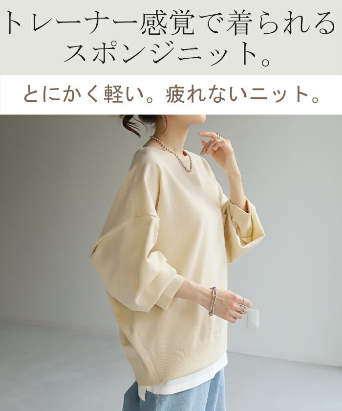 ニット 軽量 スポンジニット レディース プルオーバー セーター トレーナー トップス 軽い スポンジ 長袖 丸首 ライトニット 春ニット レイヤード チュニック お尻が隠れる ゆる きれいめ 長め 薄手 ラグラン リブ 体型カバー ブルー 黒 春 冬 HUG.U