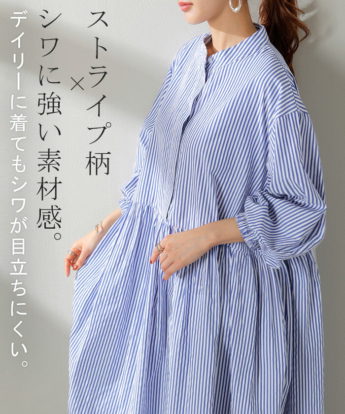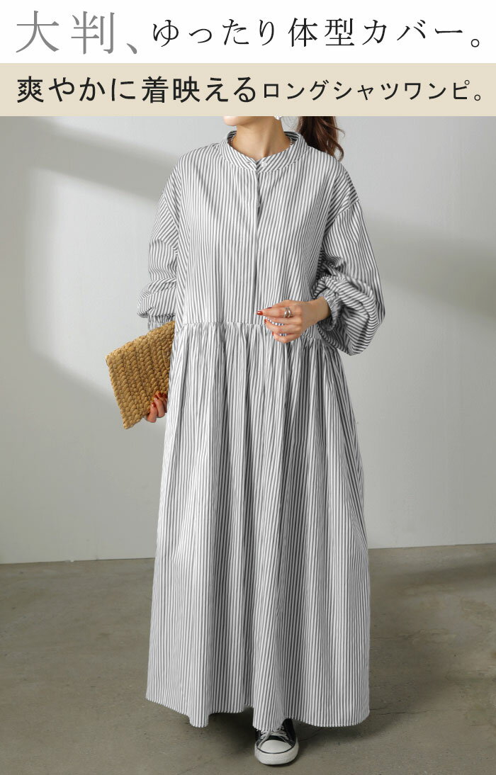 ワンピース シャツ 大判 ストライプ シャツワンピース ノーカラ— シャツワンピ レディース ロング ロングワンピース マキシ マキシワンピース ワンピ ロングシャツ ロングワンピ 長袖 羽織 きれいめ 体型カバー 大きいサイズ 青 黒 秋 冬 HUG.U