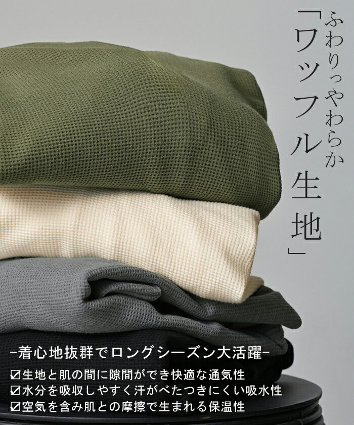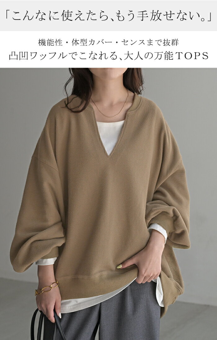 ロンT ワッフル キーネック レディース トップス オーバー プルオーバー ロング 長袖 長い 通気性 吸水性 保温性 ボリュームスリーブ Vネック リブ ゆったり 大きいサイズ 体型カバー お尻が隠れる カジュアル 黒 白 春 冬 HUG.U