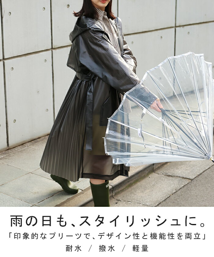 2026SS新作 レインコート レディース 自転車 バックプリーツ ロング 耐水 撥水 軽量 通勤 通学 カッパ 雨具 雨合羽 おしゃれ アウター レザー調 止水ファスナー フード付き プリーツ 体型カバー 防風 汚れにくい 雨 梅雨 きれいめ 春 夏 ホワイト ブラック HUG.U