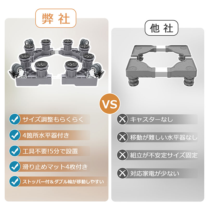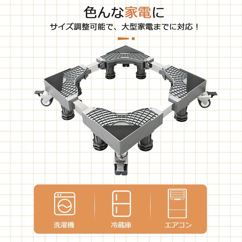 ■商品仕様 【商品名】:洗濯機置き台 キャスター付き 【サイズ】:ホワイト/グレー 【耐荷重】:300kg 【材 質】:フレーム、パイプ:ステンレス鋼 ジャッキ:ABS樹脂 キャスター:PP樹脂+ウレタンゴム 【使用用途】:洗濯機 置き台、振動音抑制、スペース確保、漏水事故防止、排水溝詰まり防止 ■商品紹介 ●大型ジャッキ8本、キャスター4本が付き、伸縮可能、高さ調整、移動可能な洗濯機置き台。 ●高品質なステンレス鋼とABS樹脂を採用して、優れた安定性を保ち、腐食に耐えます。 ●360度移動できる,耐荷重を300kgまで実現します。 ●洗濯機や冷蔵庫との接触を有効に防止できし、排水と清掃問題を簡単に解決します。 ●商品到着後60秒で組み立て完成!他社にない便利!サイズは自由に調節できて、ドラム式や全自動洗濯機などに対応しています。 ■注意事項 ■お客様がご利用のモニターの設定及び特性により、実際の商品とは色味が異なる場合がございます。 ■商品サイズは1~3cm程度の誤差が生じる場合がございます。あらかじめご了承くださいませ。 ■弊社の商品は一年の保証期間がございます、ご使用中万が一何か不具合と不明な点がございましたら、遠慮なく弊社にご連絡ください。●こちらもおすすめ 物干し 室外 スタンド 折りたたみ 洗濯機 マグネット 収納