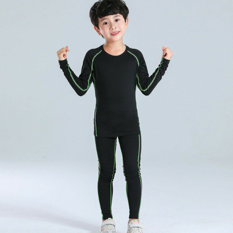 【上下セット】【裏起毛/薄型】【110~170cm】【吸汗速乾】伸縮性&速乾性&防寒性に優れたキッズ用スポーツアンダーウェア上下セット。裏起毛と吸湿発熱素材で暖かさを維持して冷えから体を守ます。着心地よく、動きやすい伸縮性の高い生地を採用し、締め付けないので初めてのコンプレッションウェアをきるお子様に最適です。ドライな着心地で不快感から開放し、集中力をアップさせ、パフォーマンスを引き出します。縫い目をフラットに縫製することで快適な肌触りを実現します。薄手/裏起毛タイプはオールシーズンに対応し、冬場でインナーとして使えば防寒対策にもなります。ランニング・トレーニング・野球・サイクリング・サッカー・スキー・スノーボードなど、様々なスポーツシーンでご活用いただけます。 サイズ 110 120 130 140 150 160 165 170 サイズについての説明 【110】肩幅33 袖長49 着丈42 ウエスト44 パンツ丈65 おすすめ身長110-120cm 【120】肩幅34 袖長52 着丈45 ウエスト46 パンツ丈68 おすすめ身長120-130cm 【130】肩幅35 袖長55 着丈48 ウエスト48 パンツ丈71 おすすめ身長130-140cm 【140】肩幅36 袖長58 着丈51 ウエスト50 パンツ丈75 おすすめ身長140-150cm 【150】肩幅37 袖長61 着丈56 ウエスト52 パンツ丈80 おすすめ身長150-160cm 【160】肩幅38 袖長63 着丈60 ウエスト54 パンツ丈85 おすすめ身長160-165cm 【165】肩幅39 袖長65 着丈64 ウエスト56 パンツ丈90 おすすめ身長165-170cm 【170】肩幅40 袖長67 着丈68 ウエスト58 パンツ丈95 おすすめ身長165-170cm ※サイズ表の実寸法は商品によって1-3cm程度の誤差がある場合がございます。ワンサイズ大きめを購入することをお勧めする。 素材 ポリエステル、スパンテックス 色 グリーン(薄手) ブラック(薄手) グレー(薄手) グリーン(裏起毛) ブラック(裏起毛) グレー(裏起毛) 備考 ●サイズ詳細等の測り方はスタッフ間で統一、徹底はしておりますが、実寸は商品によって若干の誤差(1cm〜3cm )がある場合がございますので、予めご了承ください。 ●商品の色は、撮影時の光や、お客様のモニターの色具合などにより、実際の商品と異なる場合がございます。あらかじめ、ご了承ください。 ●製品によっては、生地の特性上、洗濯時に縮む場合がございますので洗濯時はご注意下さいませ。 ▼色味の強い製品によっては他の衣類などに色移りする場合もございますので、速やかに(脱水、乾燥等)するようにお願いいたします。 ▼生地によっては摩擦や汗、雨などで濡れた時は、他の製品に移染する恐れがございますので、着用の際はご注意下さい。 ▼生地の特性上、やや匂いが強く感じられるものもございます。数日のご使用や陰干しなどで気になる匂いはほとんど感じられなくなります。