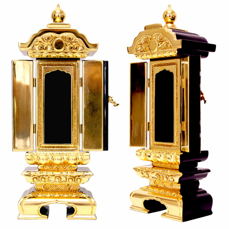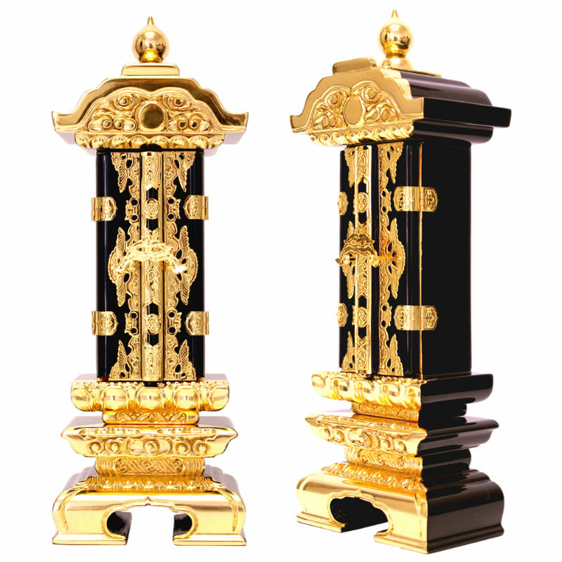 美しい雲の彫刻が特徴的な、回出位牌(繰出位牌)です。 黒の塗の上に鮮やかな金の細工が施された、色鮮やかな高級感漂う位牌となっています。 台座部分は前面が金箔仕上げとなっているため、美麗な台座へと仕上がっています。 中の白木の板は9枚入っています。 回出位牌(繰出位牌)とは? 回出位牌とは、戒名を書く板(木の板など)が複数枚、中におさまるような造りになっている箱形のお位牌の事を言います。 一般のお位牌は1つに付き、1つの名入れになりますが、回出位牌の場合は、ご先祖様のお位牌が多くなって来た時など、中に入れて1つにまとめる事ができます。 位牌のサイズ・大きさ お位牌は、4.0寸が標準・一般的なサイズになります。 ※お仏壇のサイズ・大きさによって変わってきますので、ご不明時はお問い合わせください。 ご本尊様やご先祖様のお位牌より大きくならないようにするのがお位牌のマナーとされています。 寸法高さ台幅奥行 5.0寸32.3cm11.0cm6.7cm ※材質により、多少寸法・型等が異なる場合がございます。ご了承ください。 使われている材質や素材 材質総木製、真鍮 上塗りカシュー塗り 金粉・金箔本金箔 仕上げ工程極上塗り(16工程) 原産国海外
