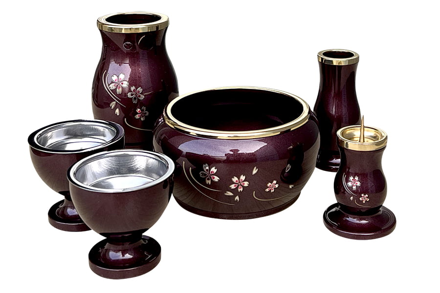 商品の特徴・説明 まさに至高の仏具と言える程、可愛らしさと優雅さと美しさが備わったモダン仏壇に合わせたくなる仏具の6点セットになります。 名前の通り、非常に美しく精巧な桜の花びらの彫りが施されており、通常の仏具よりも一層美しく、華やかな仕上がりとなっております。 またカラー展開も非常に豊富で、定番でもありオーソドックスとなるワイン系、オーク系のカラーに加え、女性や可愛らしい仏壇に合わせたいピンク系、シックな装いや大人っぽさが醸し出すマットグリーンカラーなど豊富にご用意しています。 モダン仏壇と非常に合わせやすく、桜柄のお仏壇との相性も抜群になり、どんなお仏壇とも合わせやすい今、非常に人気の高い仏具セットになります。 仏具のセット内容 仏具詳細 6点セット花立、火立、香炉、線香差し、茶湯器、仏飯器 材質真鍮製 サイズ・大きさ 仏具高さ横幅 花立9.2cm6.1cm 火立5.1cm4.0cm 前香炉4.9cm10.0cm 線香差し7.3cm3.2cm 茶湯器4.8cm4.8cm 仏飯器4.8cm4.8cm