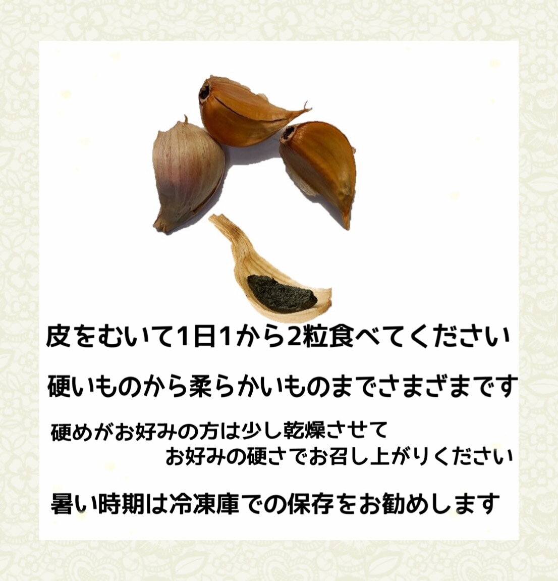 商品情報名称胞山(えなさん)完熟黒にんにく原材料名にんにく(岐阜県恵那市産)内容量1袋6球入り賞味期限別途商品ラベルに記載保存方法・御購入後は袋から出し風通しの良い所で保存していただくか、冷凍庫で保存してください。製造者または販売者有限会社東野備考常温便のお届けとなります。産地名国産(岐阜県恵那市)発送について複数ご注文頂いた場合はひと箱にまとめて発送させて頂きます。国産【岐阜県恵那産】胞山(えなさん)完熟黒にんにく6球 恵那黒にんにく 黒にんにく岐阜県 岐阜県黒にんにく えな黒にんにく 恵那山 ひがしの 甘い 柔らかい フルーティー 生産者 黒にんにく くろにんにく クロニンニク 完熟 贈答 恵那の離農に命を宿す!!土からこだわった完熟黒にんにくはしっとり甘くてフルーティー!!生産者ならではのこの価格!!! 清流の国・恵那山の麓、緑豊かな岐阜県恵那市の大地で生産したにんにくを自らの手で拘って加工しています。一定の温度・湿度の管理された室で、3ヶ月掛けて熟成・発酵させました。黒にんにく=臭いは大間違い!「黒にんにく」になると成分が変化し、にんにく特有の臭いが消えて、栄養価もUPするのでいいことづくめです。ドライフルーツのような甘くてフルーティーな味と食感がやみつきになる事間違いなし!選別途中に出た小さ目サイズを生産者ならではの価格でご提供!球の状態でのお届けなので、ご自身でバラした後、皮を剥いて召し上がって下さい。ご自身の健康維持に、また大切なあの方へのギフトにも最適です。 5