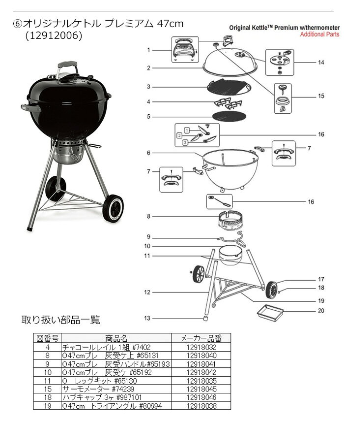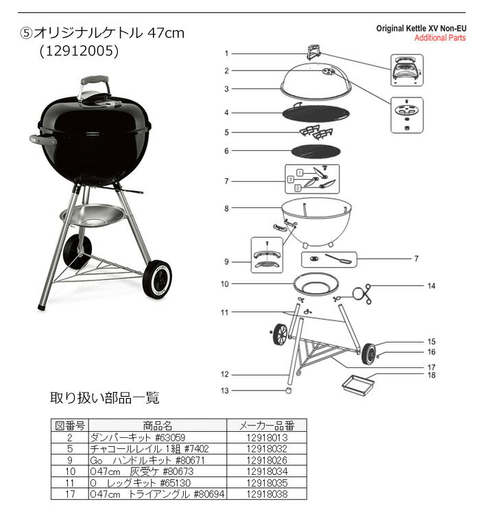 メーカー希望小売価格はメーカーカタログに基づいて掲載していますSpec ブランド名 Weber ウェーバー 商品名 オリジナル47cm レッグキット #65130 メーカー型番 12918035 サイズ カラー 詳細 オリジナルケトル/ケトルプレミアム 47cm、オリジナルケトル/ケトルプレミアム 57cmに使えるパーツです。 ------------------------------------------------------------ ※モニタやPC環境等により実物と多少色合いが異なって見える場合もございます。 ※外箱がある商品につきましては生産、運搬の過程上、商品の箱(外箱)に多少の汚れや、破れ等が生じる場合がございます。 予めご了承の上お買い求め頂きます様、よろしくお願いいたします。 ※パターン生地を使用している商品によってはパターン位置に個体差がございます。予めご了承下さい。 ※一部商品画像にメーカー提供画像を使用している商品もございますので、仕様が予告なく変更される場合がございます。 ※複数のショッピングモールで同時販売しておりますので、在庫切れになってしまう場合がございます。 厳重に注意し在庫システムで管理を行っておりますが、お買い上げいただいた商品が品切れになってしまう場合がございます。 また、人気商品に関しましても複数のお客様が一度に購入を行い、在庫の反映が間に合わずご購入できてしまう場合がございます。 その際はお客様には必ずご連絡をさせていただきますが、万が一入荷予定がない場合はキャンセルさせていただく場合がございます。 大変申し訳ございませんがあらかじめご了承ください。 ※メール便発送対象商品に関しましては、メール便規定料金にてお送りします。 ※ガス缶などをご使用いただく商品の場合、同メーカーのものをご使用いただくことを推奨しております。 製品不良などが起こった場合、保証対象外となる場合がございます。 ------------------------------------------------------------