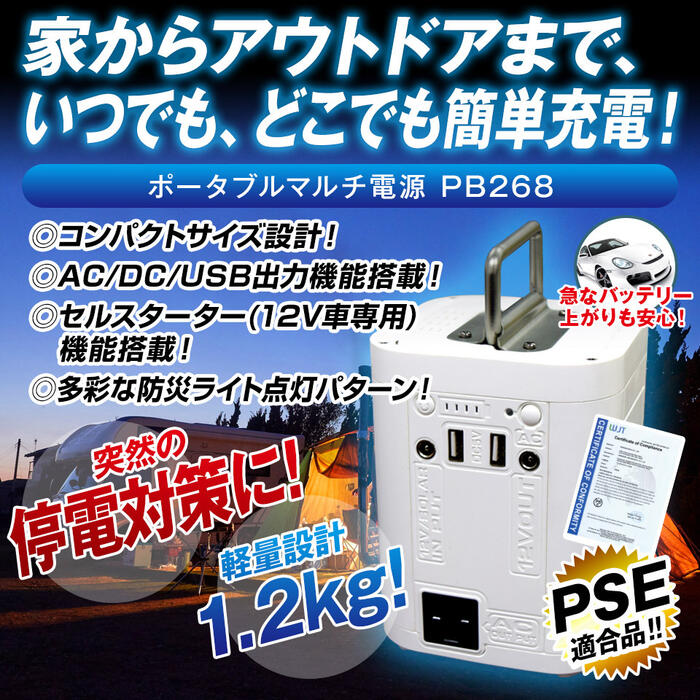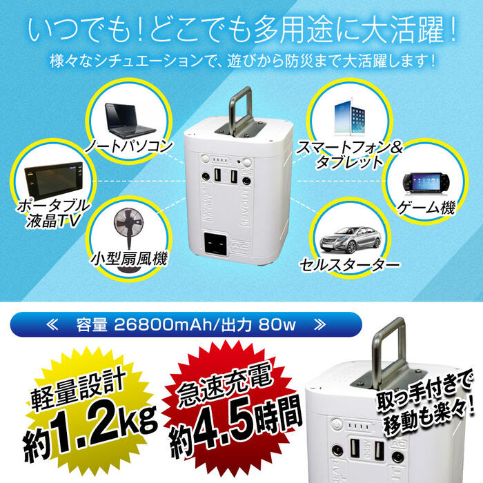 いつでもどこでも多用途に大活躍! 家からアウトドアまで、いつでもどこでも簡単充電 地震や台風時の防災グッズにも! 停電対策、避難所対策など ■セルスターター(12V車専用)機能 突然の車のバッテリーあがりも簡単始動で、多重安全保護システムも搭載しているので安心して利用できます ■複数の出力ポート搭載 AC/DC/USBの3種類の出力ポートでいろんな場面でお役立ち ■多彩な防災ライト点灯パターン・コンパクトサイズ設計 ・AC/DC/USB出力機能搭載 ・セルスターター(12V車専用)機能搭載 ・多彩な防災ライト点灯パターン PSE適合、計量設計約1.2kg、急速充電約4.5時間、容量26800mAh/出力80w 取って付きで移動もラクラク! 商品サイズ:約高さ13.3×横10.4×奥10.4cm (出力) DC出力電圧:12V DC出力電流:6A(最大) USB出力電圧:5V USB出力電流:2.4A(最大) (入力) AC入力電圧:DC12.6V AC入力電流:2A 使用温度範囲:1℃〜40℃ 内臓バッテリー:リチウムイオン電池 LED懐中電灯:2W LEDライト:5W