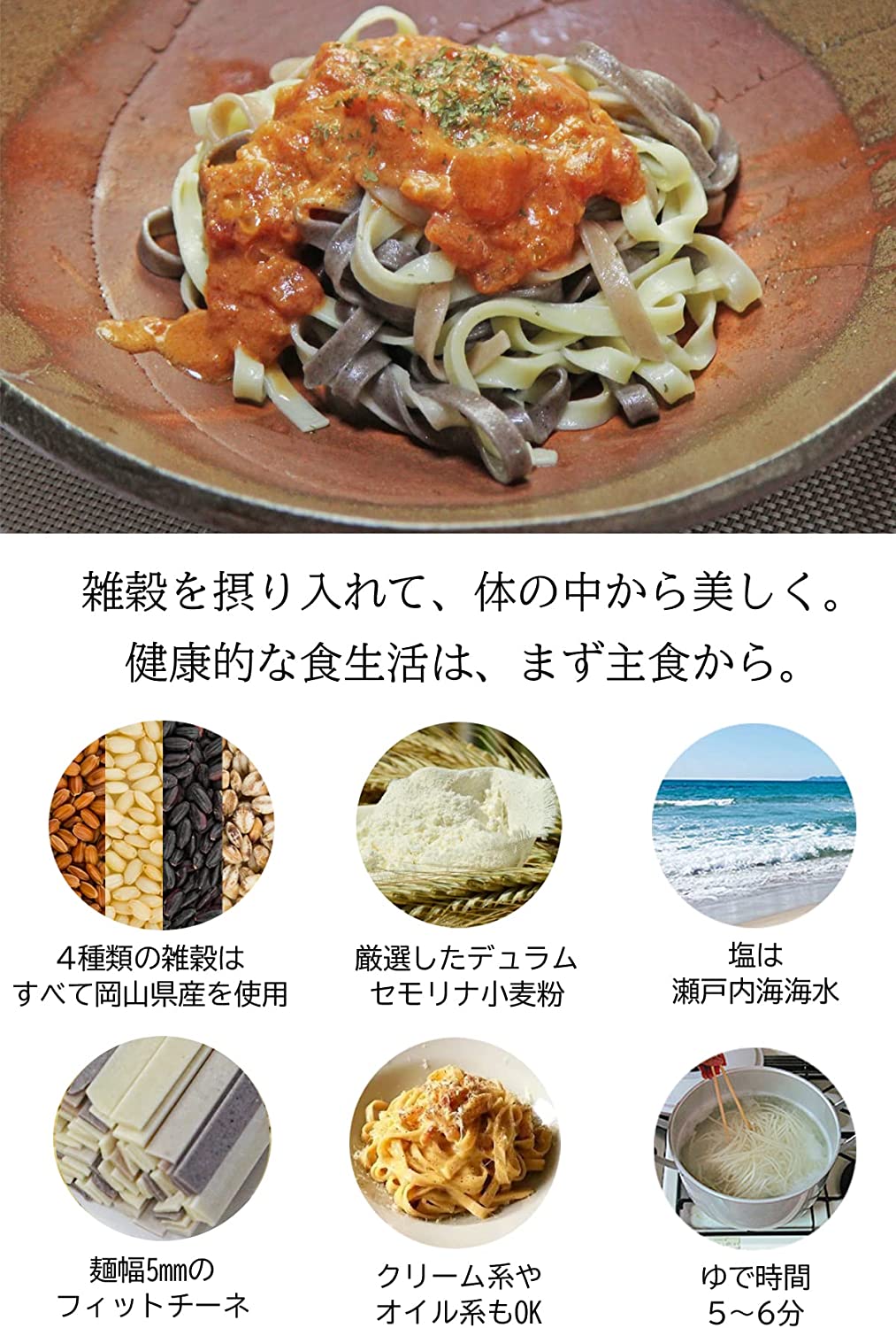 【商品説明】黒米・もち麦・赤米・玄米の4種類の雑穀パスタをミックスしました。 雑穀の様々な栄養素をいっぺんに摂り入れられます。 カルボナーラ、ミートソース、ジェノベーゼ、オイル系等どのソースでも相性の良いパスタです。【原材料】デュラム小麦粉(国内製造)、玄米粉、もち麦粉、赤米粉、黒米粉、食塩 サイズ:約20×180×250mm重量:約1000g 原産地:日本保存方法:常温賞味期限日数:360日アレルギー:小麦