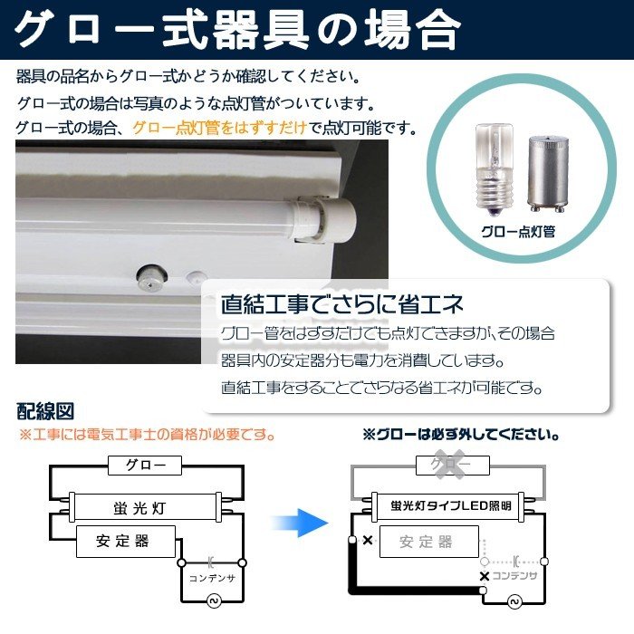 LED蛍光灯 40W形 グロー式器具工事不要 【製品仕様】 口金:G13(蛍光灯タイプ) 定格電圧:AC 85-265V 消費電力:18W 全光束:3200LM 色温度:昼光色(6500K)、昼白色(5000K)、電球色(2700K)選択 材質:航空用アルミ基板+PC透光カバー 演色性:Ra85以上 ※明るさは色温によって異なりますのでご注意ください。 ※使用上の注意 ・グロースターター式の器具の場合は工事不要で、グロー球を外すだけで使用できます。 ・ラピッド式・インバーター式の器具の場合は直結工事しても使用できます。安定器によって使用できないことが判明した場合はご返品対応いたします。 <保証について> 初期不良はもちろん対応とさせていただきます。 <送料について>条件付き送料無料 5本以上の場合送料無料 追加送料:北海道[315円]、沖縄・離島[1500円]