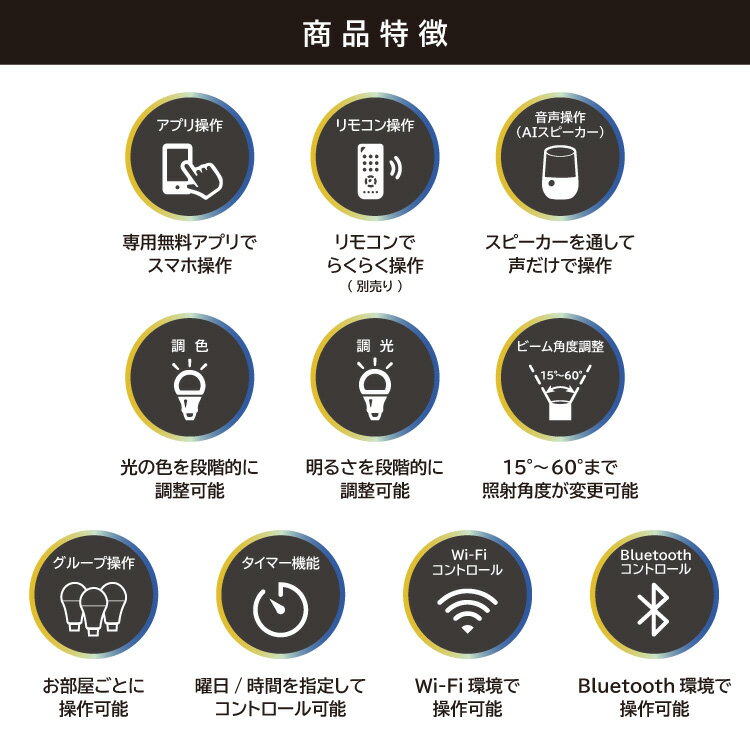 【商品仕様】 サイズ(mm) (約)φ60x縦150x横160mm 材質 アルミ・PC 重量(g) (約)560g 色温度(K) 2700K〜6000K 消費電力 13W カラー ホワイト / ブラック 取付方法 ダクトレール専用 全光束(lm) 電球色 MAX900lm 照射角度 上下方向可動:90° 回転方向可動:350° 演色性 Ra90以上 1グループ最大登録個数(アプリのみ) Bluetooth接続:iPhone最大6灯 / android最大5灯 Wi-Fi接続:iPhone/android最大12灯(※Wi-Fiルーターの最大接続台数によっては接続できない場合がございます。) (操作可能距離:最大20m) リモコンでの最大同時操作個数(※リモコン別売り) 最大20灯(※場合によりデバイスに電波が届かず反応しない場合がございますが、その際はもう1度同じ操作を行ってください。) (操作距離:最大20m ※障害物・壁等がない場合) 定格電圧(周波数) AC100V (50/60Hz) 調光器 非対応 使用上の注意 商品のデザイン・仕様は改善のため、入荷のタイミングにより予告なく変更する場合がございます。ご了承ください。 実物に近い色を画像で表現していますが、撮影環境、お使いのディスプレイなどの条件によって多少の誤差が生じる場合がございます。 ご注文タイミングやご注文内容によっては、購入履歴からのキャンセル、修正を受け付けることができない場合がございます。 FAQ よくある質問 関連キーワード 光ノ屋照明 ヒカリ屋の照明ライト hikariya 一体式スポットライト 明るい 角度 調整 可能 ダクトレールスポットライト 調光 調色 光ノ屋照明smart APP 照明 アプリ操作 APP操作 スマホ操作 リモコン操作 スマート照明 天井ライト レールライト ダクトレールライト リビングライト 廊下ライト 玄関ライト キッチンライト ダイニングライト カフェライト 店舗ライト インテリアライト LED対応ライト おしゃれライト 室内ライト ランプ 天井ランプ リビングランプ 廊下ランプ 玄関ランプ キッチンランプ ダイニングランプ カフェランプ 店舗ランプ インテリアランプ LED対応ランプ おしゃれランプ 室内ランプ ダクトレール照明 天井照明 リビング照明 廊下照明 玄関照明 キッチン照明 ダイニング照明 カフェ照明 店舗照明 インテリア照明 LED対応照明 おしゃれ照明 室内照明 照明器具 スポットライト 玄関灯 1灯 電気 電灯 ルームライト LED 電源内蔵型 電球交換不要 工事不要 簡単取付け 天井 室内 部屋 リビング 居間 内玄関 廊下 階段 トイレ 食卓 ダイニング カウンター キッチン パントリー 寝室 ベッドルーム 吹き抜け 洗面所 子供部屋 和室 一人暮らし バー カフェ 新築 マイホーム 賃貸 ダクトレール対応 1年保証 一年保証 日本規格 PSE認証済 新生活 インテリア 生活空間 デザイン おしゃれ かわいい 可愛い かっこいい シンプル スマート 北欧インテリア 韓国インテリア シンプル レトロ アンティーク ヴィンテージ カントリー カフェ風 アジアン オシャレ お洒落