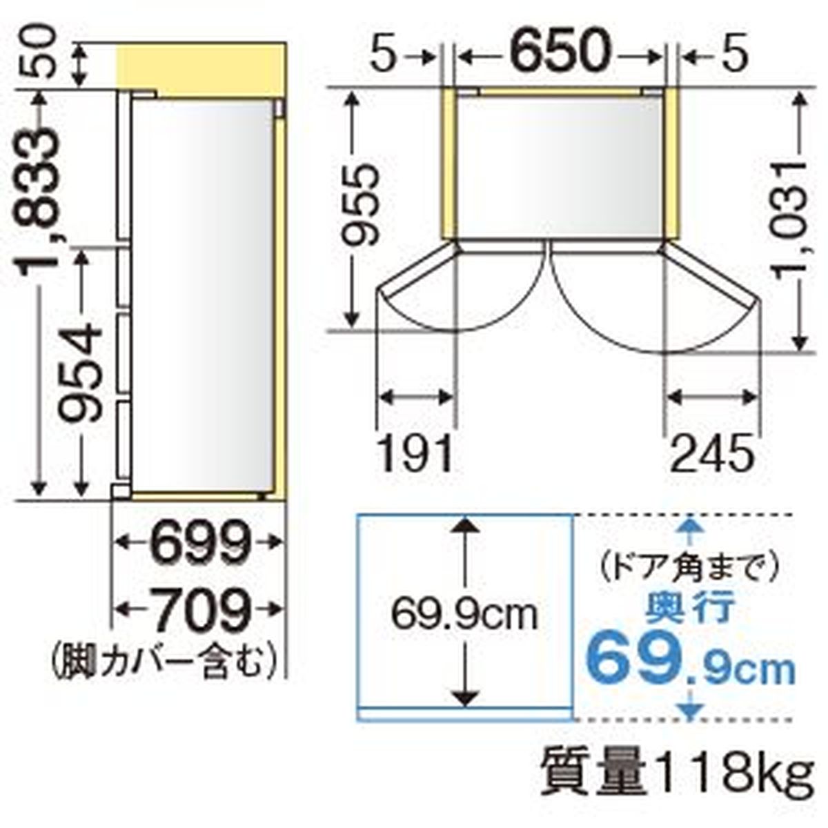 ※2024年10月1日からの「新しい東京ゼロエミポイント」には当店は参加していません。幅65cmで、たっぷり大容量547L。【商品の特徴】・たくさん買い物しても大丈夫 驚きの収納力と使いやすさを両立しました 中だけひろびろ大容量・食品を最適温度で保存 わが家の生活パターンで運転してくれる 全室独立おまかせA.I.・ラクに楽しく、家族が喜ぶメニューを スマホで食生活を上手にサポートしてくれる つながるアプリ・凍っていてもサクッと調理 解凍なしですぐに使えるから、うれしい! 切れちゃう瞬冷凍A.I.・冷凍いらずで、すぐに使える 生のまま長持ちするから、うれしい! ひろびろ氷点下ストッカーD A.I.・新鮮野菜で料理を楽しむ うるおいたっぷり、ビタミンCもアップ! クリーン 朝どれ野菜室 朝収穫したばかりの野菜のように、みずみずしく新鮮に保ち、栄養素が増える野菜室できました。・製氷皿からポンプまで 給水経路を全て洗えてきれいに製氷。 まるごと清水クリーン・まとめ買いしても、たっぷり入る! しっかり冷凍室・三菱ならではの技術と工夫で省エネ・節電。 省エネ・節電部屋別おまかせエコ【商品の仕様】■カラー:グランドクレイベージュ■ドアタイプ:フレンチドア■ドア数:6■定格内容積:547L{冷蔵室298L、製氷室21L、瞬冷凍室29L、冷凍室99L、野菜室100L}■寸法: 外形 幅650×奥行699×高さ1833mm 据付必要奥行 709mm■質量:118kg■年間消費電力量:266kWh/年※詳細は公式HPをご確認ください。