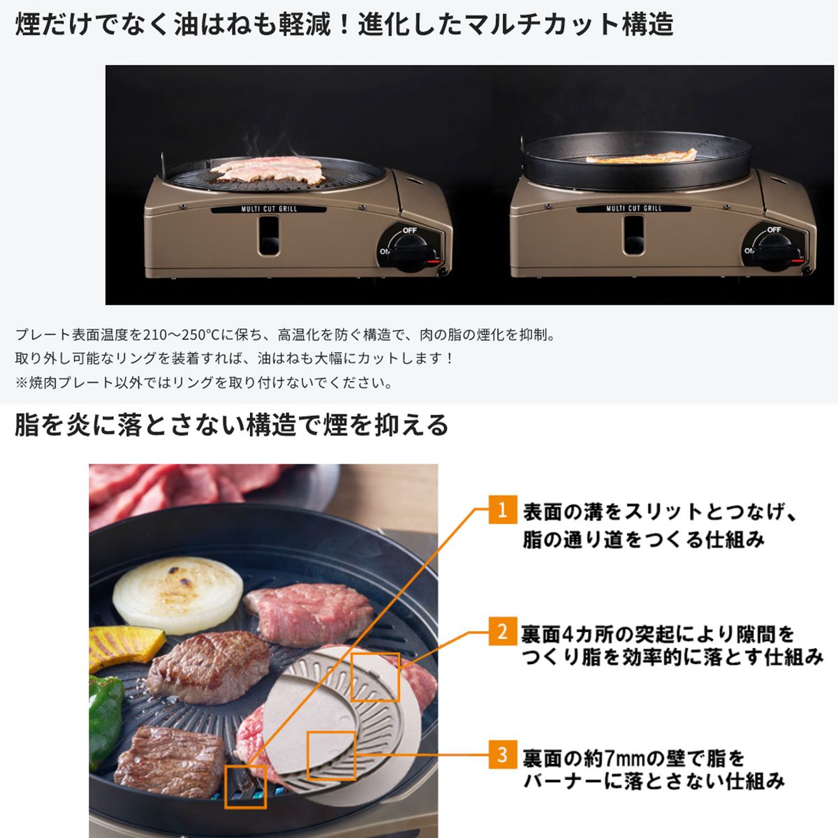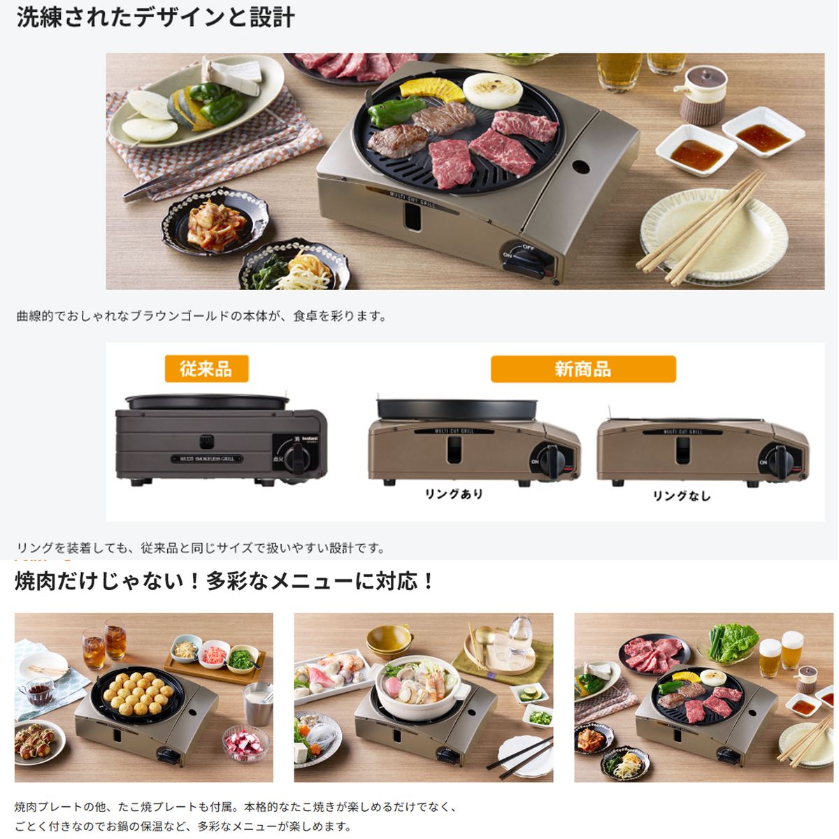 マルチスモークレスグリルがデザインを一新してリニューアル。ガード付きで、煙だけでなく気になる油はねも軽減! ■カセットこんろに珍しい曲線形のおしゃれなデザインでおうち焼肉をワンランクアップ。■取り外し可能なガード(名称:リング)を搭載。本体やテーブルの油はねを軽減します。■プレート位置を低くし薄型化に成功したことで、ガード付きでもトータルの高さは従来品(MSG)と同等です。■高級感のあるブラウンゴールド。煙を気にせず室内で焼肉ができる! ■プレートの表面温度を210〜250℃に保つことで、肉の脂が煙化することを抑制します。さらに炎に脂が当たらない構造なので、焼肉中の煙の発生が抑制されます。※特許構造採用■肉を焼く際に出る脂は水皿に落ちるのでヘルシーな焼き上がり。楽しさ広がる「たこ焼き」プレート付属 ■直火のパワーで、熱ムラが少なく全体がきれいに焼けます。脚がごとくにはまりこむ構造なので、安定した調理が可能です。カセットこんろ機能も搭載 ■ごとく付きなので、お鍋の保温にも使用することができます。 *推奨鍋:6 号土鍋、イワタニマルチプレート 付属品 焼肉プレート 2 枚、たこ焼きプレート、取っ手商品サイズ (幅)319×(奥行)279×(高さ)144 mm※じゃま板含む※フチまでは 132mm※外から見た油はねガードの高さ:28.4mm商品重量(ホ゛ンヘ゛含まず) 焼き肉プレート搭載時:約 2.1kg(リングあり)たこ焼きプレート搭載時:約 2.1kg(リング無し)こんろ使用時:約 1.8kg (リング無し)カラー ブラウンゴールド最大発熱量 1.0 kW (900 kcal/h)連続燃焼時間 *イワタニカセットカ゛ス使用時*標準鍋:直径14cm こんろ使用時(標準鍋搭載):約 213 分焼肉プレート搭載時:約 217 分たこ焼きプレート搭載時:約 217 分点火方式 圧電点火方式容器脱着方式 マグネット方式安全装置 圧力感知安全装置、容器装着安全装置使用ガス イワタニカセットガス材質 本体:鋼板(粉体塗装)焼肉フ゜レート:アルミタ゛イカスト(フッ素樹脂加工)たこ焼きフ゜レート:アルミタ゛イカスト(フッ素樹脂加工)ごとく:耐熱 ADCバーナー:耐熱 ADC点火つまみ:ABS 樹脂商品荷姿 化粧箱入り個装箱サイズ 約(幅)332×(奥行)285×(高さ)163 mm個装箱重量 約 3.1kgカートンサイズ 約(幅)585×(奥行)343×(高さ)350 mmカートン重量 約 13.3kg