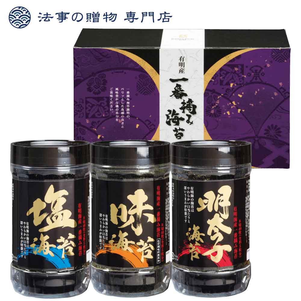 ●セット内容:一番摘み味海苔(8切40枚)×1、一番摘み塩海苔(8切40枚)×1、一番摘み明太子風味海苔(8切40枚)×1●箱サイズ:220×70×135mm●生産国:日本●様々な用途の引き出物、返礼品、お返しの品物にご利用下さい。志 法事 法要 初七日 四十九日 忌明け 粗供養 五十日祭 香典返し 満中陰志 偲び草 一周忌 三回忌 七回忌 一年祭 三年祭 十年祭 御供 彼岸 初盆 新盆 茶の子●様々な用途の引き出物、返礼品、お返しの品物にご利用下さい。志 法事 法要 初七日 四十九日 忌明け 粗供養 五十日祭 香典返し 満中陰志 偲び草 一周忌 三回忌 七回忌 一年祭 三年祭 十年祭 御供 彼岸 初盆 新盆 茶の子