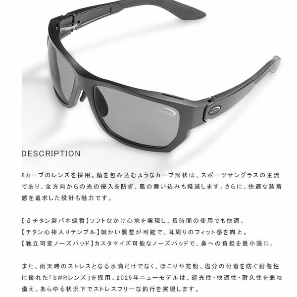 サイトマスターのサングラスをもっと釣りに活用していただく為のプレゼント企画! サイトマスターのサングラス購入者様全員にバッグやベストなど、 どこでも取り付け可能な当店オリジナルタクティカル眼鏡ケースをプレゼント。 おすすめポイント ・サングラスをいつでもどこでも取り出せる。 ・セミハードケースで衝撃に強い。 ・ライニング(内側)はウレタンシートを配置し保護力を高めています。 ・500デニールの耐久性抜群のファブリック。 ご注文の際に眼鏡ケースカラーをお選びください。 ----------------------------------------------------------オクトマットブラック スーパーライトグレー(SWR) シリーズ最大級の視界の広さに8カーブの遮光性と防風性 8カーブのレンズを採用。顔を包み込むようなカーブ形状は、スポーツサングラスの主流であり、全方向からの光の侵入を防ぎ、風の舞い込みも軽減します。さらに、快適な装着感を追求した設計も魅力です。【βチタン製バネ蝶番】ソフトなかけ心地を実現し、長時間の使用でも快適。【チタン心棒入りテンプル】細かい調整が可能で、耳周りのフィット感を向上。【独立可変ノーズパッド】カスタマイズ可能なノーズパッドで、鼻への負担を最小限に。また、雨天時のストレスとなる水滴だけでなく、ほこりや花粉、塩分の付着を防ぐ耐傷性に優れた「SWRレンズ」を採用。2025年ニューモデルは、遮光性・快適性・耐久性を兼ね備え、あらゆる状況下でストレスフリーな釣行を実現します。 ■SPECブリッジ幅×レンズ横幅×レンズ縦幅×フレーム幅(mm)18×53×34×148mm8カーブケース、クリーニングクロス付属 ※写真の色と実際の商品の色は多少異なる場合がございます。 ※商品画像はメーカー提供のサンプル画像です。 製品仕様・デザインは改良のため予告なく変更される場合がありますのでご了承ください。 この商品のお支払いはキャッシュレス決済(クレジット決済・ポイント支払い)のみです。 ・キャッシュレス決済(クレジット決済・ポイント支払い)以外をお選び頂いた場合、注文後の変更が出来ないため、ご注文のキャンセル処理をいたします。 ※ご注文後のお客様都合によるキャンセルや変更は承っておりませんので、ご確認の上ご注文をお願いいたします。 正規品 未使用新品 当店のブランド商品は全て本物です。安心してショッピングをお楽しみください。