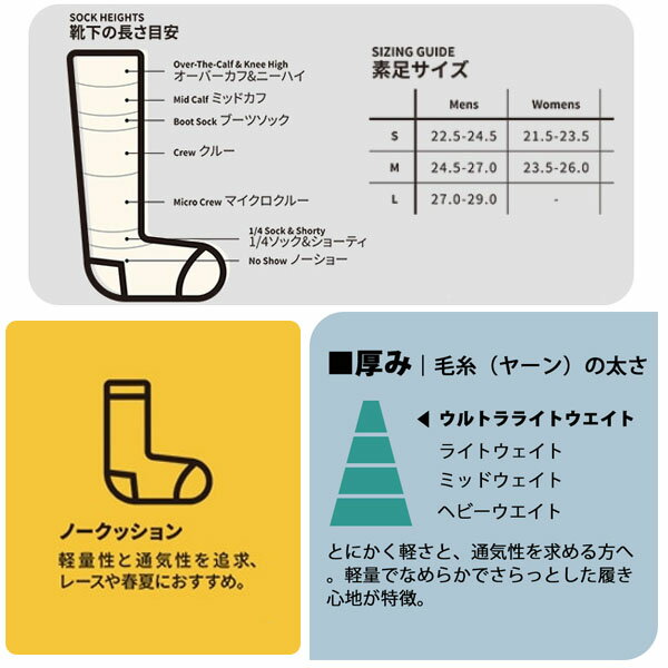 ダーンタフ メンズ 8002 ペナント RFL オーバーカフ ウルトラライトウェイトDARN TOUGH ダーンタフ メンズ 8002 ペナント RFL オーバーカフ ウルトラライトウェイトはウルトラライトウェイトで素肌に近く、滑りにくい構造で疲労を軽減するアーチサポート、メリノウールのパフォーマンス、ドロップニードルデザインなど、全ての要素を満たしているスキーやスノーボードに最適なソックスです。軽量で高いフィット感と通気性を実現し、束感のないスキーブーツ体験を提供します。かかとから履き口までの長さが平均17インチで、膝下まで脚をカバーします。また、シームレスで滑らず、束にならず、ブーツとの一体感を感じながら、快適な履き心地です。マルチゾーン・メッシュパネルは通気性と屈曲性を向上させるとともに、かさばりを抑え、プレッシャーポイントを軽減し、補強されたアキレス腱とフットベッドは、快適性、耐久性、フィット感を向上します。メリノウールには熱と湿気を逃がす性質があり、スキーヤーやスノーボーダーの足を暖かくドライに保ちます。また、軽量なソックスは通気性と温度調節機能のバランスが良く、一日中足を快適に保ちます。・ウルトラライトウェイト:とにかく軽さと、通気性を求める方へ。軽量でなめらかでさらっとした履き心地が特徴。・ノークッション:超軽量で滑らか。スキーやスノーボードに最適な薄手のソックスです。●TRUE SEAMLESS(リング編みつま先構造):非常に柔軟性に優れ密に編み込まれたテリーループ構造で、つま先部分をシームレス化し、快適な履き心地を実現●お手入れ方法:ダーンタフソックスを長持ちさせるために、ソックスを裏返して、液温40℃を限度とし、洗濯機で弱水流で洗ってください。漂白剤の使用及びドライクリーニングは避けて下さい。乾燥機に掛ける場合は、低温にしてください。■SPEC■・サイズ:M(24.5cm-27.0cm)、L(27.0cm-29.0cm)・素材:ナイロン60%、メリノウール35%、Lycraスパンデックス5%・クッション:ウルトラライトウェイトノークッション・適用カテゴリー:スキー、ライド DARN TOUGH VERMONT(ダーンタフバーモント)とは ダーンタフバーモントは、親子3代にわたりバーモント州でソックス紡績工場を営んでいるキャボット・ホージャリー・ミルのオリジナルブランドとして、2004年に誕生しました。 靴下工場として40年積み上げた技術を生かし、より革新的で耐久性に優れたソックスを作り続けています。 ※メーカーやモデル等によりサイズ感は異なります。サイズは目安としてお考えください。 ※写真の色と実際の商品の色は多少異なる場合がございます。 ※商品画像はメーカー提供のサンプル画像です。 製品仕様・デザインは改良のため予告なく変更される場合がありますのでご了承ください。 正規品 未使用新品 当店のブランド商品は全て本物です。安心してショッピングをお楽しみください。