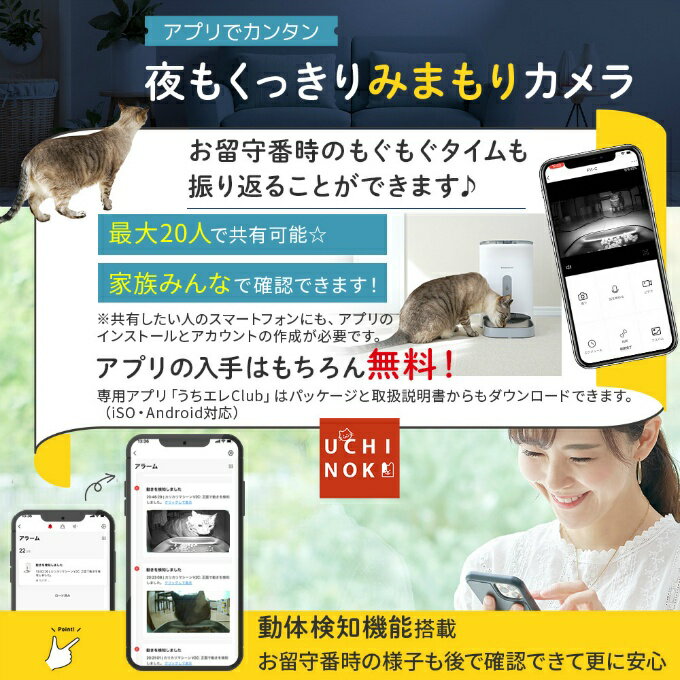 スマホ連動カメラ付きタイマー式自動給餌器 ■サイズ:約幅24cmx奥行32cmx高さ38cm ■容量:4.5L ■重量:約2.6kg ■原産国:中国 ■商品詳細:ステンレストレイ標準 ■付属品:5gアタッチメント 検索ワード:猫 犬 カメラ付き スマホ操作 自動餌やり機 給餌器 餌 エサ えさ ペット 乾燥剤 密閉 ロック 蓋が閉まる 洗える 見守りカメラ スマホ連動 カリカリマシーン うちのこエレクトリック