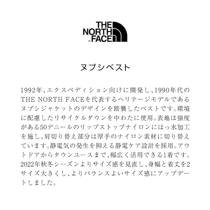 1992年、エクスペディション向けに開発し、1990年代のTHE NORTH FACEを代表するヘリテージモデルであるヌプシジャケットのデザインを踏襲したベストです。環境に配慮したリサイクルダウンを中わたに使用。表地は強度がある50デニールのリップストップナイロンにはっ水加工を施し、肩切り替え部分は厚手のナイロン素材に切り替えています。静電気の発生を抑える静電ケア設計を採用。アウトドアからタウンユースまで、幅広く活用できる1着です。 2022年秋冬シーズンよりサイズ感を見直し、身幅と着丈を2サイズ大きくし、よりバランスよいサイズ感にアップデートしました。 ■カラー:TG(TNFグリーン) ■サイズ(cm): S(着丈/63、身幅/59、肩幅/46) M(着丈/65、身幅/61、肩幅/47) L(着丈/67、身幅/63、肩幅/49) XL(着丈/69、身幅/65、肩幅/51) ※製品によって仕上りサイズに多少の誤差がありますのでご了承下さい。 ■素材: 表地/50D Recycled Nylon PolyRip with DWR(ナイロン100%) 中わた/Green Recycled CLENDOWN(R)(ダウン80%、フェザー20%) 肩部分・裏地/Recycled Nylon Cloth(ナイロン100%) ■機能:ビルトインフード仕様/裾調整可能なアジャスター付き ■特徴: ・撥水コーティング ・CREANDOWN 三重県にあるダウン&フェザーメーカーである河田フェザーが生み出す、高品質の国内精製ダウンの総称です。マシンを使った徹底的な除塵・洗浄・乾燥といった工程を経ることで、水鳥の原毛に付着したほこりや垢などを取り除き、天然羽毛そのものが持つ能力の最大化を追求しています。 ・GREEN DOWN GREEN DOWN RECYCLE PROJECTは、限りある資源であるダウン(羽毛)を回収、精製し、「GREENDOWN」という名前で、ダウンウエアをはじめとする新たな製品の原料として利用するプロジェクト。ダウンを焼却する際に発生する二酸化炭素(ダウン1kgで約1.8kgの二酸化炭素を排出)と、原産国から日本に送られる際の二酸化炭素を抑えられます。 ・ポケッタブル 未使用時には折り畳んで、本体のポケットに収納。コンパクトに携帯可能です。 ・静電ケア設計 静電気の発生を抑える部材を使用し、静電ケアに配慮。 ・GREEN MATERIAL 環境への負担を最小限に抑える素材を選んで使用します。 検索ワード:アウター アウトドアウェア トレッキングウェア キャンプ アウトドア レジャー 緑 グリーン トレッキングウェア アウター ヌプシベスト ダウン 中綿 はっ水 静電ケア アウトドア レジャー 上着 カジュアル 防寒 冬ベスト 重ね着 キャンプ ハイキング トレッキング フェス 旅行 登山 トラベラー ハイカー フィッシング 釣り スポーツ観戦 屋外作業 通勤 通学 静電気ケア フルジップ ビルトインフード コンパクト 携帯性 ポケッタブル エコ素材 リサイクル素材