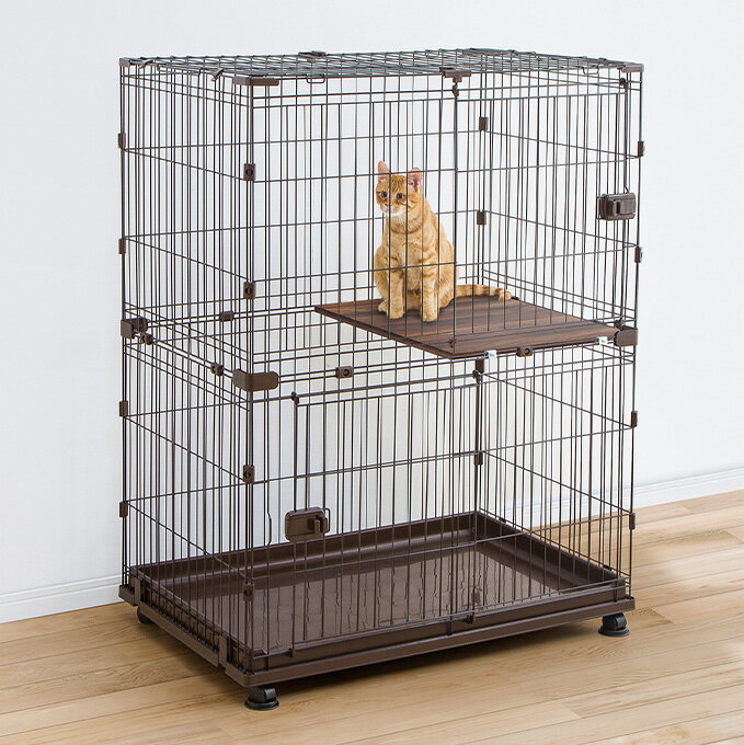 猫ちゃん用!タテに広々で快適な2段セット。 人気のコンビネーションサークルの新デザイン! 棚板が木目調、線材がマットになり、さらにお部屋に合わせやすいデザインに! タテ・ヨコつなげて増やせるコンビネーションサークル。 成長や用途に合わせて、自由にカスタマイズ。 新しくねこちゃんを迎え、家族が増えたら、大きくなってきたら、ペットに合わせて楽しくアレンジ。 右開き・左開きどちらも可。 はめ込むだけの簡単ジョイント採用。 受け皿で固定できるキャスター付きでお掃除もラクラク。 プラスチックトレーでお手入れ簡単。水で丸洗いもOK! 横にケージを増やしたいときは、専用パーツをつけて固定するだけで簡単に連結可能。 ★お客様組立★ ■カラー:ウォールナット ■商品サイズ(cm): 幅約93×奥行約65×高さ約122 ■トレー内寸(cm): 幅約82×奥行約50 ■入口内寸(cm): 幅約38×奥行約49 ■棚板(cm): 幅約44×奥行約57 ■材質: 線材:スチール(エポキシ樹脂塗装) トレー・バックル・ジョイント:ポリプロピレン 扉ロック:ABS樹脂 キャスター:ポリプロピレン、スチール(亜鉛メッキ) キャスター受け:ポリエチレン 棚板:合成樹脂化粧パーティクルボード(メラミン樹脂) ■対象: 猫 検索ワード:ペット 犬 猫 ケージ ゲージ サークル
