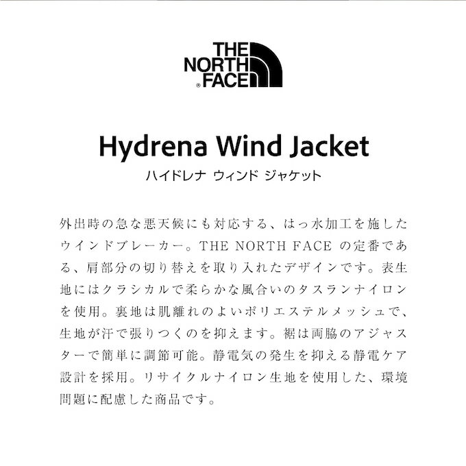 外出時の急な悪天候にも対応するはっ水加工を施したウィンドブレーカー。 表地にはクラシカルでやわらかな風合いのタスランナイロンを使用。裏地は肌離れのよいポリエステルメッシュで、生地が汗で張りつくのを抑えます。裾は両脇のアジャスターで簡単に調節可能。フロントフラップはドットボタン仕様です。 THE NORTH FACEの定番である、肩部分の切り替えを取り入れたデザインです。 ■カラー:K ( ブラック ) ■サイズ: XS(着丈/66cm、身幅/55cm、裄丈/83cm) S(着丈/68cm、身幅/57cm、裄丈/86cm) M(着丈/70cm、身幅/59cm、裄丈/89cm) L(着丈/72cm、身幅/61cm、裄丈/92cm) XL(着丈/74cm、身幅/63cm、裄丈/95cm) ※製品によって仕上りサイズに多少の誤差がありますのでご了承下さい。 ■素材: 表地/Recycled Taslan Nylon Cloth ( ナイロン100% ) 裏地/Polyester Mesh ( ポリエステル100% ) ■特長: ・ビルトインフード仕様 ・フロントフラップドットボタン仕様 ・裾調整可能なアジャスター付き ・はっ水機能 ・静電防止部材を採用して静電気の発生を抑える ・GREEN MATERIAL/リサイクル原料や植物由来原料など環境への負荷に配慮した素材。 ■原産国:ベトナム 検索ワード:アウター アウトドアウェア アウトドアジャケット トレッキングウェア トレッキングジャケット アウトドア ハイドレナウィンドジャケット メンズ レディース 上着 トップス はっ水加工 メッシュ 裾調整 フード収納可能 ボタン シンプル 雨?
