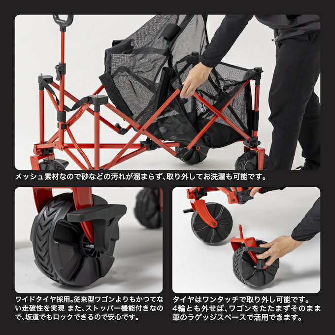 取り外し可能なタイヤでそのまま車載可能。ワイドタイヤで卓越したオフロード性能 ■サイズ: 使用時/約109x69x96cm 収納時/約35.5×40×84(h)cm 荷台/約88x42x31(h)cm ※製品によって仕上りサイズに多少の誤差がありますのでご了承下さい。 ■重量:約11.5kg ■耐荷重:約100kg ■付属品:フック付きラバーバンド、収納ケース ■素材: 生地/ポリエステル フレーム/スチール ■特長: ・タイヤはワンタッチで取り外し可能 ・取り外し可能なタイヤでそのまま車載可能 ・ワイドタイヤで卓越したオフロード性能 ■原産国:中国 検索ワード:アウトドア キャンプ キャリーカート キャリーワゴン 運動会 お花見 キャリーカート キャリーワゴン 折りたたみ 大容量 アウトドア用品 キャンプ キャンプ用品 キャンプ道具 キャンプグッズ 初心者 山 海 ビーチ 公園 フェス バーベキュー BBQ 運動会 屋外イベント クラブ活動 部活動 ブラックシリーズ