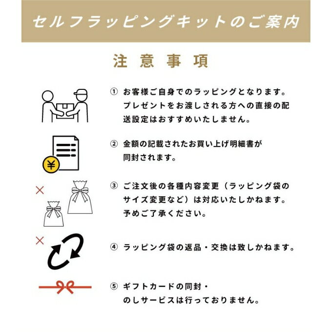 商品詳細・注意事項をよくご確認頂き、ラッピング希望の商品と一緒にご注文ください。 ※お客様ご自身でのラッピングとなるため、プレゼントをお渡しされる方への直接の配送設定はご遠慮ください。 ※金額の記載されたお買い上げ明細書が同封されます。お渡しの際はご注意ください。 ※のしサービスは行っておりません。 ※ご注文後の各種内容変更(ラッピング袋のサイズ変更など)は対応いたしかねます。 予めご了承下さい。 ※ラッピング袋の返品・交換はいたしかねます。 注文方法について ・ラッピング希望商品と一緒に買い物かごへ入れてご注文ください。