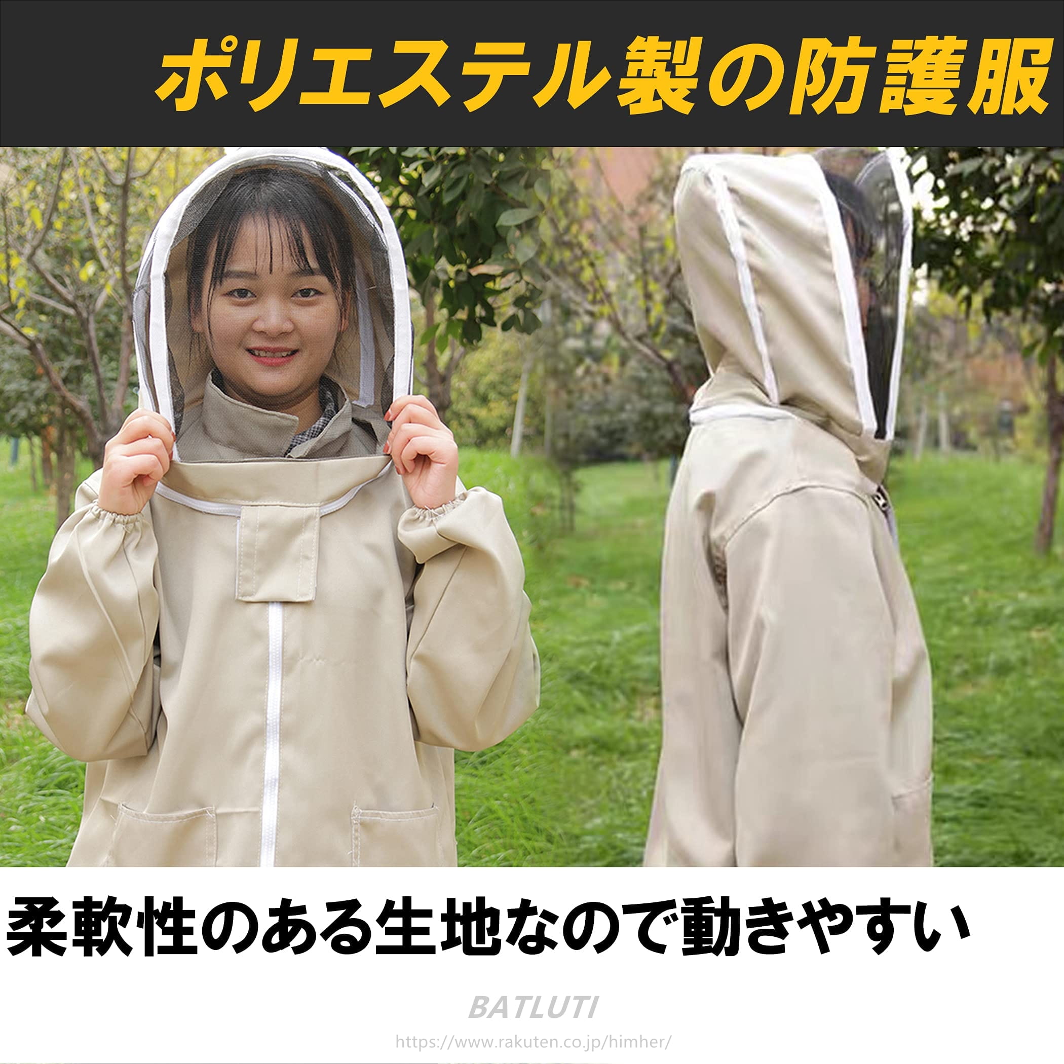 柔軟性のある生地なので動きやすい:防護服は、養蜂において欠かせないアイテムです。防護服の中には生地がゴワゴワしていて動きにくく、作業がしにくいものもあります。この防護服はポリエステル製の生地を採用しているので、柔軟性があり、着心地も快適です。 着脱がしやすい:この防護服はツナギタイプではなく、パーカーのように羽織るタイプとなっています。そのため、着脱がとてもしやすく便利です。ファスナー式なので隙間から蜂が入ってくることもありません。 広い視界を確保できる:顔の前面と側面にフェイスネットが備わっているので、広い視界を確保することができ、作業をスムーズに進めやすいといえるでしょう。また、フード部分の脱着もできるので、巣箱から離れた場所で作業する際には外すこともできます。 フリーサイズの防護服:フリーサイズの防護服となっているので、体型を問わずに着用しやすいといえるでしょう。また、袖口からの侵入がしにくい設計なので、しっかりと蜂から身を守ることができます。 材質:ポリエステル サイズ:フリー カラー:ピンクベージュ ※モニターの環境により、色の見え方に若干差が生じる場合があります。
