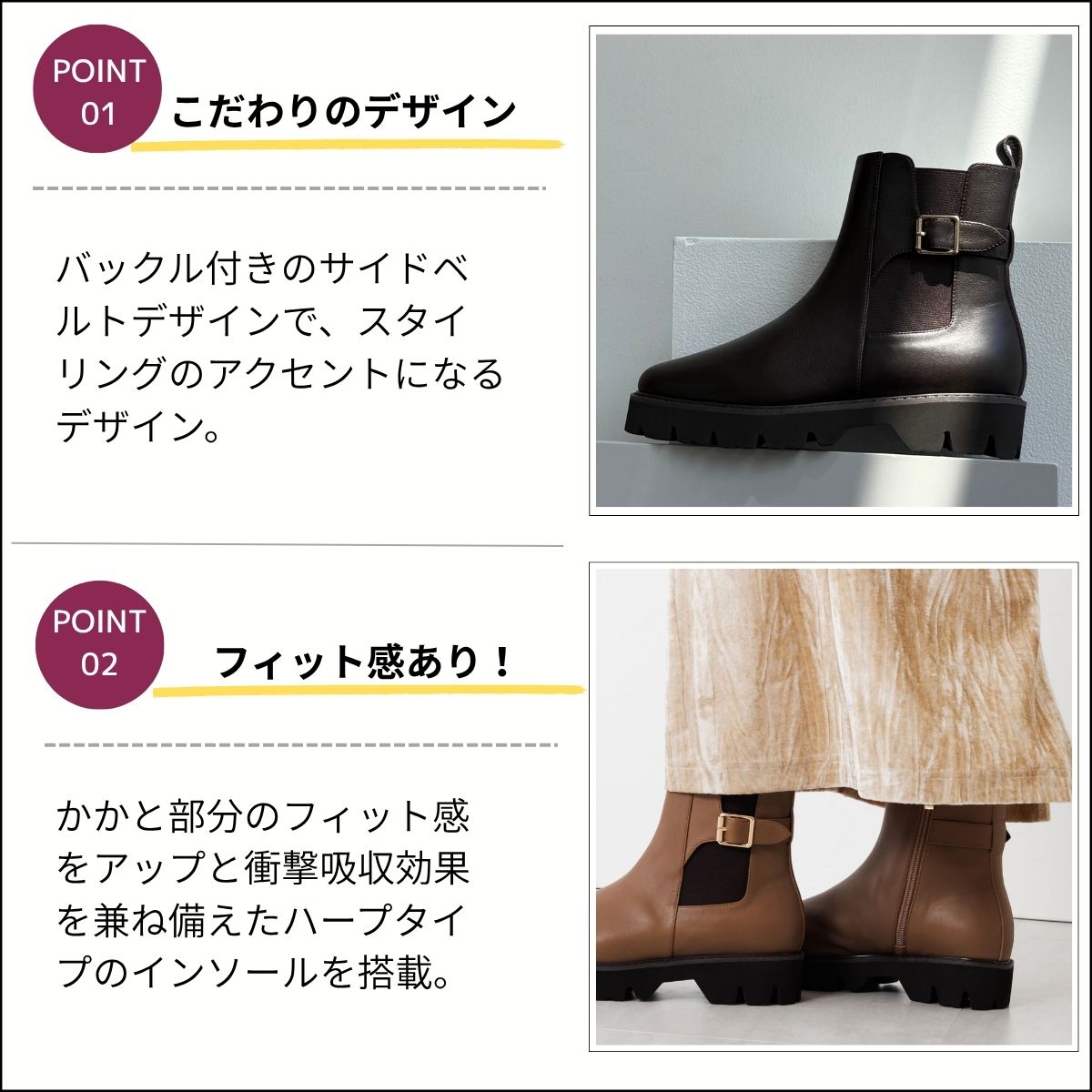 程よい厚みのあるトラックソールのサイドゴアブーツは毎年人気のアイテム。今季はバックル付きのサイドベルトデザインでさりげないアクセントに。 中敷きにはかかと部分のフィット感アップと衝撃吸収効果を兼ね備えたハーフタイプのインソールを搭載。ソフトな撥水レザーを使用しているので足当たりも柔らかく、軽量ソールで楽に履けるのがポイントです。 足首をすっきり見せるフィット感のあるシルエットにこだわり、トレンド感がありながらも履き心地も安心な一足です。【LWG】全色 ※画像の商品はサンプルです。実際の商品と色味、仕様、加工、サイズ、素材等が若干異なる場合がございます。 型押しコンビストレッチブーツ/651420 レースアップブーツ/651407 トラックソールサイドジップストレッチブーツ/651403 チャンキーヒールストレッチブーツ/651423 機能 撥水 蓄熱素材 中敷きクッション つま先快適クッション ノンスリップ中敷 ●ヒール高: 4cm ●筒丈:17.0cm(※23.5cmで計測) ●筒周り:23.0cm(※23.5cmで計測) ●素材: 牛革 ●原産国: 日本 ●幅: E ●重さ(片足):338.0g(※23.5cmで計測) 【展開サイズ】 21.5 22.0 22.5 23.0 23.5 24.0 24.5 25.0 25.5 26.0 26.5 【展開カラー】 ブラック ブラウン ダークブラウン メーカー希望小売価格はメーカー商品タグに基づいて掲載しています。