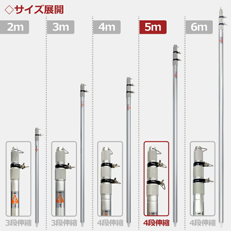 材質アルミ合金サイズ(最大)5m(4段伸縮)フリーサイズで調整可能です。サイズ(最小)145cm直径(最大)35mmφ重さ1419グラム三角カンの数3個(先端に1つ+スライド式が2つ)長さの調節フリーサイズで可能、最大4m。製造国日本推奨の旗のサイズ◎140×210cmより大きいもの スペック表 経(mm) 厚さ(mm) 長さ(mm) 重さ(g) 2m 1段目 28 1.2 661 180 縮小時の高さ 78cm 2段目 24 1.0 682 133 スライドカン 1 3段目 20 1.0 722 116 石突 5.8cmΦ25.5mm 計 429 商品ページはこちら 3m 1段目 32 1.2 981 303 縮小時の高さ 110cm 2段目 28 1.2 1,002 273 スライドカン 1 3段目 24 1.0 1,042 203 石突 5.8cmΦ28.5m 計 779 商品ページはこちら 4m 1段目 35 1.2 965 332 縮小時の高さ 126cm 2段目 32 1.2 986 304 スライドカン 2 3段目 28 1.2 1,027 280 石突 6.0cmΦ32mm 4段目 24 1.0 1,066 208 計 1,124 商品ページはこちら 5m 1段目 35 1.2 1,235 425 縮小時の高さ 145cm 2段目 32 1.2 1,246 381 スライドカン 2 3段目 28 1.2 1,297 354 石突 6.0cmΦ32mm 4段目 24 1.0 1,326 259 計 1,419 商品ページはこちら 6m 1段目 35 1.2 1,536 511 縮小時の高さ 172cm 2段目 32 1.2 1,571 468 スライドカン 2 3段目 28 1.2 1,626 429 石突 6.0cmΦ32mm 4段目 24 1.2 1,651 324 計 1,732 商品ページはこちら寸法について2m〜6mまで5種類あります。収縮時は145cmまで縮みます。 店長(身長178cm)を目安にしてください。旗サイズを選ばないスライド式三角カン。 旗の大きさに合わせ、好きな位置で固定できます。10秒で準備完了♪ 三角カンにヒモを結ぶだけ。 蝶結びでOKですので、誰でも取り扱い可能です。このポールの特徴軽くて丈夫なアルミ合金製。 色はキレイなツヤ消し銀色です。 室内でお使いの際にも雰囲気を壊しません。上部はネジ穴式。 一般的な国旗球や剣先のネジに対応しています。 もちろん当店の全製品に対応しています。オプション品別売りの「かんざし」をつけるとノボリ用のポールとしても使えます。当店はこんな会社です。
