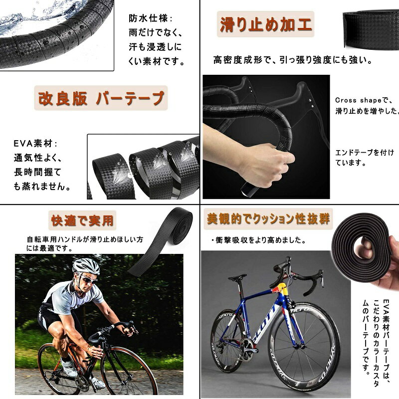 ハンドルバーテープカーボン柄 シルバー 商 品 説 明 衝撃吸収力に優れる快適な握り心地、高密度成形で、伸縮性があり引っ張り強度にも強いハンドル バーテープです。シンプルで幅広く自転車に合うデザイン。 エンドキャップも付属していますので末端の処理も簡単です。 商 品 仕 様 サイズ 長さ2m、幅3cm 重さ 32g セット内容 バーテープ×2、エンドキャップ×2、エンドテープ×2 保 証 に つ い て ■メーカー保証なし 記載の注意事項を除く初期不良品の場合のみ、商品到着から1週間以内のみ対応いたします。 ご到着後はお早めに商品状態をご確認ください。 注 意 事 項 ●こちらの商品は、新品です。 ●モニター環境により、実際のカラーと異なって見える場合がございます。 ※商品の発送は定形外郵便での発送となります。(代引支払は不可、荷物の追跡不可)※この商品は運送便の都合上、化粧箱を外して簡易包装で発送する場合がございます。プレゼント用にご購入される場合はご注意願います。<定形外郵便に関する注意事項> ・ 定形外郵便に関しては基本的にポストに投函する為、 配達時に何らかのトラブル等が有り、万一、購入された商品が配送事故・紛失・破損等によりお手元に届かない場合でも弊社は責任を負いかねますので予めご了承下さい。(配送中の事故等は、免責とさせて頂きます。) ・ 定形外郵便に関しては代金引換払い及び時間指定サービスはご利用頂けません。 ・ 通常便と比べると到着までに時間がかかります。 ・ 伝票番号による荷物の追跡を行うことはできません。