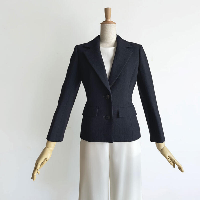 ◆テーラードジャケットは ◇2つボタンにフラップポケットでデザインはたいへんシンプルです。 ◇衿の返りはラペル裏側にダーツをとり、甘く女性らしい胸元です。 上衿も衿腰を低くし、シャープなキャリアのテーラードとは異なる 優しいエレガントなテーラードにこだわりました。 袖口は3つボタンの本開き仕立てです 。 ■サイズ(cm)出来上がり寸法 (7号) 【ジャケット】 B:90 袖丈:56 着丈:57 肩幅:37.5 --------------------------------- (9号) 【ジャケット】 B:94 袖丈:57 着丈:58 肩幅:38.5 --------------------------------- (11号) 【ジャケット】 B:98 袖丈:58 着丈:59 肩幅:39.5 ■仕立て 肩パット5mm 裏つきキュプラ100% スペアー付き ■カラー:紺 ■表地:ウール100%(ダブルジョーゼット) ■裏地:キュプラ100% 日本製生地尾州 縫製岩手 動画提供:旭化成(株)様 メーカー希望小売価格はメーカー商品タグに基づいて掲載しています