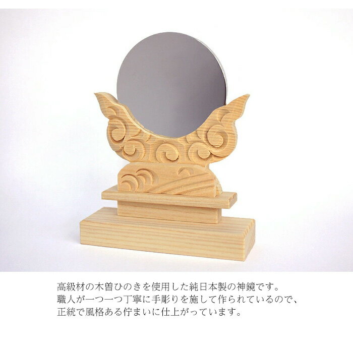 商品名木曽ひのき神鏡 2寸 サイズ(約) 外寸: 幅9x高さ10.5x奥行3cm 鏡: 直径6cm 台座: 幅9x高さ8x奥行3cm 材質台座:木曽ひのき鏡:ニッケル合金 生産国日本木曽ひのき神鏡 2寸 日本製 木曽桧 木曽檜【神具 鏡 神鏡 桧 檜 神棚 国産】 木曽桧を贅沢に使用 職人彫りの日本製高級材の木曽ひのきを使用した純日本製の神鏡です。職人が一つ一つ丁寧に手彫りを施して作られているので正統で風格ある佇まいに仕上がっています。台座の彫刻はより高い場所を意味する雲をあらわしています。鏡を磨くことによって悪い気が出てしまうとされているため、年に一度のお取りかえをおすすめしております。 【サイズ(約)】外寸: 幅9x高さ10.5x奥行3cm 鏡: 直径6cm 台座: 幅9x高さ8x奥行3cm 【材質】台座:木曽ひのき 鏡:ニッケル合金【生産国】日本 手彫りの為、一つ一つ個体差が生じる場合がございます。※モニター発色の具合により色合いが異なる場合がございます。 ※在庫状況によっては納品に時間がかかる場合がございます。【キーワード:神具 神鏡 鏡 雲 お正月 正月 迎春 新春 元旦 年末年始 謹賀新年 伝統 縁起 縁起物 神棚 厄除け 厄払い お祓い 祓具 祈祷 御祈祷 祈願 無病息災 開運厄除 家内安全 身体健全 除災得幸 家祈祷 方位除け 鬼門除け 厄年 厄年開運 開運 ベージュ 無垢材 ひのき ヒノキ 桧 檜 桧木 檜木 木曽ひのき 木曽桧 木曽檜 木曽桧木 木曽檜木 木曽ヒノキ 木製 シンプル 職人製 職人彫り 日本製 国産 神棚の里】 2