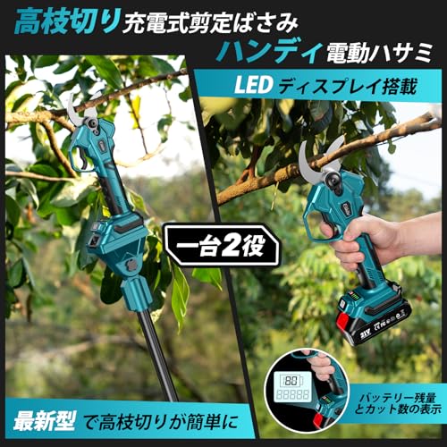 2025年新登場Elikliv 高枝切りバサミ 開き口40mm 電動 たかえだきりばさみ 強力 電動剪定バサミ 一台2役 4段階開き角度調整可能 LEDディスプレイ搭載 ブラシレスモーター採用 充電式剪定ばさみ 延長ポール90cm-150cmまで伸ばす ヘッド部分角度調整可能