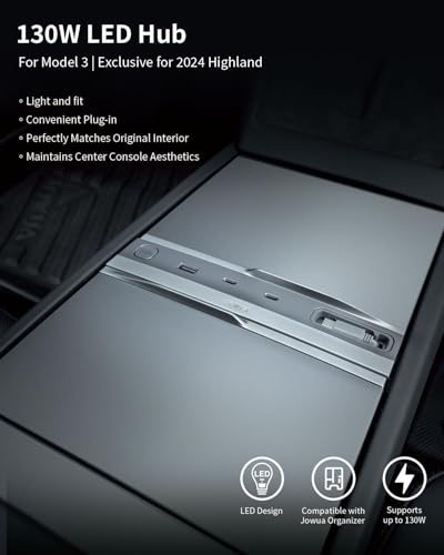 JOWUA 130W LEDハブ Tesla 2025年モデルY、リエンジニアドモデル3ハイランド(2024+)、Type-Cポート2つ、USB-Aポート1つ、Type-Cケーブル1つに対応。