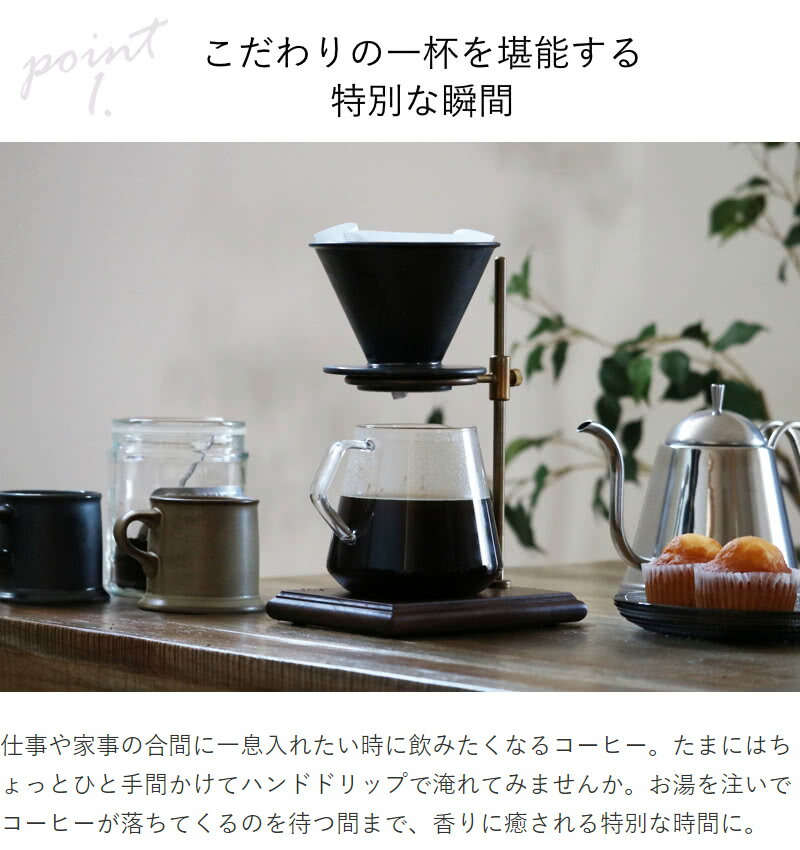 丁寧な手仕事と、ゆっくりとした時間を尊ぶ人へKINTO/SLOW COFFEE STYLE SPECIALTYブリューワースタンド仕事や家事の合間に一息入れたい時に飲みたくなるコーヒー。たまにはちょっとひと手間かけてハンドドリップで淹れてみませんか。お湯を注いでコーヒーが落ちてくるのを待つ間まで、香りに癒される特別な時間に。真鍮と天然木を組み合わせた味わいのあるデザインのスタンド。ひとつずつブラストがかけられアンティーク品のような雰囲気を醸し出しており、使っていない時も飾っておきたくなる佇まいです。スタンドのフィルター位置は可動式で、最大15.5cmまで高さの調節ができます。マグカップをはじめ、タンブラーや小さめの水筒などにも淹れられます。自分好みのコーヒーを外でも愉しめれば、疲れたときに心がほどける瞬間が作れます。耐水性のあるウレタン塗装が施されていますが、水やお湯に浸すことは厳禁。ご使用後は固く絞ったふきんでお手入れしてください。天然木の特性上、温度や湿度の影響により多少の反りやヒビが生じることもあります。直射日光を避けて、乾燥した状態で保管してください。スタンドの裏面には「SLOW COFFEE STYLE SPECIALTY」のロゴが刻印され、見えないところにもこだわりが。また、四隅にシリコーンゴムの滑り止めも付いているので安定感もあります。お手持ちのドリッパーを合わせるのはもちろん、シリーズに専用の陶器製ドリッパーもご用意があります。色々試して、自分好みのコーヒーに辿り着く過程もハンドドリップならではの愉しみ方です。SLOW COFFEE STYLE SPECIALTY(スローコーヒースタイルスペシャリティ)は、職人が細部にまでこだわり、心地よさと個性を持たせたコーヒーウェアのシリーズ。手にしたとき、目にしたときに時の流れをゆるやかにし、コーヒーの味わいに奥行きを与えてくれます。SIZEGARALLYSERIESドリッパー2人用ドリッパー2〜4人用ドリッパースタンド専用2人用ドリッパースタンド専用2〜4人用ドリップスタンド鋳物製ドリップスタンド真鍮製他のSLOW COFFEE STYLE SPECIALTYシリーズはこちらBRANDKINTO(キントー)KINTOのアイテムに共通するのは、空間の中で静かに存在感を放つ、シンプルでありながら上質な「佇まい」。そして、触れてこそわかる、持つ、注ぐ、飲むなどの日常の動作を踏まえた「使い心地」です。触れるたび、使うたび、こころ満たされるものづくりを目指し、商品の企画開発を手掛けています。SPECサイズ約 幅16.5×奥行13×高さ25(cm)重量:約460g内容量1個材質天然木 (ウォールナット、ウレタン塗装)、真鍮、18-8 ステンレス鋼、シリコーンゴム生産国中国製仕様詳細食洗機不可、乾燥機不可備考※画像はシリーズ商品を含むイメージです。※スタンドは手作りのためサイズや形状が各々多少異なります。※天然木を使用しているため色や木目に多少のばらつきがございます。※真鍮はキズ、黒ずみ、凹みのような跡が見られる場合がございます。※真鍮は湿度の影響により変色しますので、水に濡れたまま放置しないでください。※真鍮はまれに緑色のサビが発生する場合がございますが、品質には問題ございません。※お客様のお使いのモニター設定、お部屋の照明等により色味が実際と異なる場合があります。キャンセル・返品区分小型商品CAMPAIGN関連キーワード: コーヒー 珈琲 器具 道具 ドリップコーヒー ハンドドリップ 天然木 コーヒー用品 プレゼント ギフト おしゃれ かっこいい おすすめ シンプル アンティーク風 キッチン用品 キッチン雑貨 コーヒー雑貨 コーヒーウェア バレンタイン 母の日 父の日 誕生日 クリスマス HT3