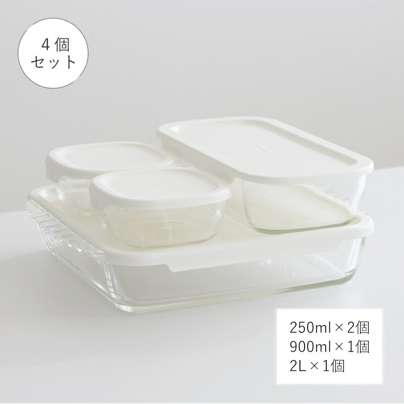 食材の下ごしらえから調理、保存、食器としても使える耐熱ガラス製の保存容器。キッチンから食卓までマルチに活躍してくれます。グラタンや野菜のグリルなどオーブン調理にも使えます。※オーブン使用時はフタを外してください。付属のフタを付けたままレンジで加熱しても大丈夫。ラップ不要で、別のお皿に移す必要もないので時短にも◎※フタは密閉タイプではありません。調理後はそのまま食器としても使えるシンプルで美しい佇まい。ガラスの透明感が料理を色鮮やかに引き立ててくれます。洗い物が減らせるのも、うれしいポイントです。ガラスは匂い移りがしにくく冷蔵保存にぴったり。煮物や酢の物、カレーなども気兼ねなく入れられます。冷蔵庫に入れる時は重ねてコンパクトに。容器が透明だから、重ねていても中身が一目で分かります。片付ける時は入れ子にして食器棚へ入れれば、省スペースに収まります。ガラス製で油落ちがよく、凹凸が少ないシンプルな形は洗うのがラク♪食洗機OKなので、忙しい日は他の食器と一緒にまとめ洗いを。TYPE OF SETSIZEDETAILGARALLYBRANDHARIO(ハリオ)HARIOは創業1921年当初から耐熱ガラスの企画・製造・販売を行う老舗メーカーです。日本で唯一、耐熱ガラス工場を保有し、コーヒーやティー関連器具、キッチンウェアなど生活に彩をそえる幅広い商品を展開しています。SPECサイズ250ml:約 幅11.1×奥行10.7×高さ4.7(cm)600ml:約 幅14.3×奥行13.9×高さ6.2(cm)900ml:約 幅23.8×奥行12.5×高さ5.6(cm)1.4L:約 幅27×奥行14.5×高さ6.2(cm)2L:約 幅26.7×奥行24.3×高さ5.9(cm)種類4個セット/6個セット/7個セット内容量4個セット(250ml×2個・900ml×1個・2L×1個)6個セット(250ml×2個・600ml×2個・900ml×1個・1.4L×1個)7個セット(250ml×4個・900ml×2個・2L×1個)材質本体:耐熱ガラスフタ:ポリプロピレン生産国日本製仕様詳細〔耐熱ガラス〕食洗機可、電子レンジ可、オーブン可直火不可耐熱温度差:120℃〔フタ〕食洗機可、電子レンジ可オーブン不可耐熱温度:140℃備考※フタは密閉タイプではありません。※お客様のお使いのモニター設定、お部屋の照明等により色味が実際と異なる場合があります。キャンセル・返品区分小型商品CAUTION返品について以下の点は製造上の特性であり、こちらを理由とした返品はお受けできません。ご確認の上、ご購入くださいますようお願いいたします。・ガラスに微小な線(筋)のような跡が残っている場合があります。CAMPAIGN関連キーワード: ガラス 保存 容器 そのまま 食卓 耐熱 ガラス製保存容器 4点セット 四角 250ml 900ml 2L 重ねて収納 蓋レンジ ごはん 食洗機対応 レンジ対応 オーブン対応 食洗機ok 食洗器 レンジ 対応 ガラス容器 蓋 ふた 付き セット 食材保存 調理 下ごしらえ 野菜 おかず ご飯 グラタン皿 オーブン調理 食器 シンプル ナチュラル クリア ハリオ(Hario) 耐熱容器 調理用品 キッチン用品 キッチン小物 テーブルウェア プレゼント ギフト 結婚 引越し 祝い 新生活 一人暮らし おしゃれ 食品 ストック 保存容器食品 ハリオ耐熱ガラス 耐熱皿 ガラス製 食品ストック