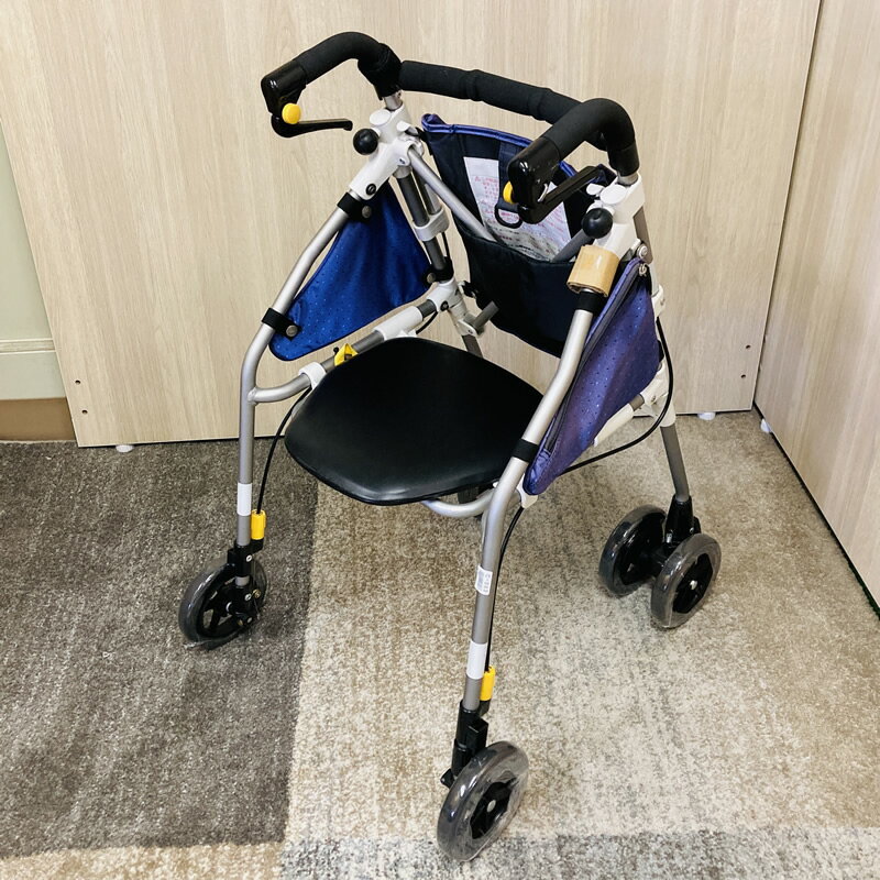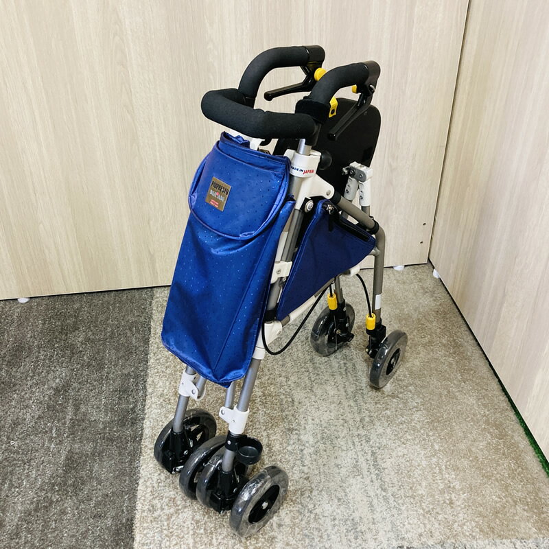 スタッフメモ: 車体の状態はとても良いです。 バッグは日焼けが少し強く見受けられます。なので特価にて。 レバーハンドル部分もキズ等ありません。車体のフレームには多少使用キズはあります。ご了承願います。実店舗の住所 埼玉福祉会 ケアプラザ彩ふく内 ひとにやさしい、モノショップ。 埼玉県新座市堀ノ内3-7-31 電話:048-424-3331 スタッフメモ: 車体の状態はとても良いです。 バッグは日焼けが少し強く見受けられます。なので特価にて。 レバーハンドル部分もキズ等ありません。車体のフレームには多少使用キズはあります。ご了承願います。 項目 詳細 商品特長 足元のスペースが広く、とても歩きやすい歩行車です。 コンパクトで座れるタイプの歩行器です。 前輪は3WAY仕様で、3段階から選べます。 折りたためば、幅27cmと小さくなり持ち運びにも便利です。 左右にトライアングルサイドポーチを採用 キャスター:3Way 固定・左右40度・360度 タイプ:前押しタイプ ○体をすっぽり 体をスッポリ支え、楽な姿勢で歩行をサポート。 ○ハンドル4段階 体に合わせて、ハンドルの高さを4段階調節。 ○ブレーキ調整 手元ブレーキがききにくくなったら、ネジを回して簡単調節。 ○ハンドルには駐車用ストッパー付き。ボタンを押すとストッパーがかかります。 ○折りたたみ ワンタッチでコンパクトに折りたためます。 ○さびにくい軽量アルミ仕上げ。 ○つえ傘立て うれしい気配り、杖・傘立て付き。 ○暗い夜道も安心の反射板付き。 標準機能/折りたたみ、3WAYキャスター(360°・左右40°・固定)、手元ブレーキ、駐車ブレーキ、座面、杖・傘立て スタッフより 中古品なのでタイヤやシート・手すり部分に使用感がありますが、できるだけ状態のいいものを販売しています。 メーカーの保証期間は終わっております。また、部品等も廃番になっていることもございますので、基本的に修理は受け付けておりません。その点予めご了承のうえお買い求めください。また、返品不可となります。ご注意願います。 材質 フレーム:アルミ(一部プラスチック)、バッグ:ポリエステル サイズ 幅50×奥行62×高さ81.5~89(4段階/2.5cm)cm、折りたたみ時:幅27×奥行62×高さ82cm、座面:幅30×奥行30cm、座面高:43cm、ハンドル内幅:31cm ●車輪サイズ/前輪14.5×後輪14.5cm バッグ容量 2.8L バッグ積載荷重 2kg 重量 5.2kg 最大使用者体重 75kg 生産国 日本 メーカー ウィズワン