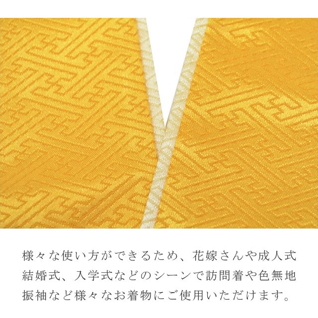 商品情報 重ね衿 ラミエール 綸子 ペアカラー 着物 和装 お洒落小物 伊達衿 振袖 卒業式 成人式 袴 結婚式 訪問着 入学式 小紋 色無地 花嫁 洗える ポリエステル 4通り使える No.46 雄黄 玉子色 sin7615-bob09 【新品】【着物ひととき】 ★説明 No.46 雄黄 玉子色 の重ね衿です。 色やけ色落ちがせず、お洗濯をしても縮まず風合いも変わりません。 4通り使える万能な重ね襟です。 様々な使い方ができるため、花嫁さんや成人式や卒業式、結婚式、入学式など訪問着や色無地、振袖など様々な着物に使うことができます。 ★納期 メーカーからのお取り寄せ商品となります。通常1週間程度での発送となります。★素材 表地:ナイロン100%(アルミ箔使用)芯地:レーヨン60%、ポリエステル40%縫製糸:ポリエステル100%※ご注意:洗濯・アイロン不可です。 ★着用シーン セミフォーマル〜フォーマル ★サイズ 長さ約125cm 幅約6cm ★担当 検品:長谷川 入力:川口 着物ひとときではリサイクル着物やリサイクル帯が豊富に揃っています!リサイクルの着物で困りがちな裄や身丈のお直しはもちろん、着物のクリーニングなどのお手入れも大人気!お気軽にお電話またはLINEなどからお問い合わせくださいませ。 ※モニターの違いにより実際の色目と異なる場合がございます 宅配便発送の方 ゆうパケット発送の方 メール便発送の方■関連キーワード ママ振袖 ママ振り 振袖 中古 リサイクル着物 重ね衿 かさねえり kasaneeri 重ねえり 重ね襟 衿 着物衿 長襦袢 キラキラ 十二単 刺繍 結婚式 パーティー 卒業式 入学式 式典 華やか 豪華 検索用キーワード 中古 リサイクル着物 着物 KIMONO 七五三 お宮参り お稽古 着付け教室 着物帯 木綿 訪問着 単衣 踊り 反物 リメイク ジュニア 絽 セット 色無地 結婚式 披露宴 入学式 卒業式 観劇 お食事会 お茶会 同窓会 パーティ お茶会 観劇 お食事会 園遊会 祝賀会 ショッピング 初心者着物 お値打ち価格 和服 20代 30代 40代 50代 60代 70代重ね衿ラミエール綸子ペアカラー着物和装お洒落小物伊達衿振袖卒業式成人式袴結婚式訪問着入学式小紋色無地花嫁洗えるポリエステル4通り使えるNo.46雄黄玉子色sin7615-bob09【新品】【着物ひととき】