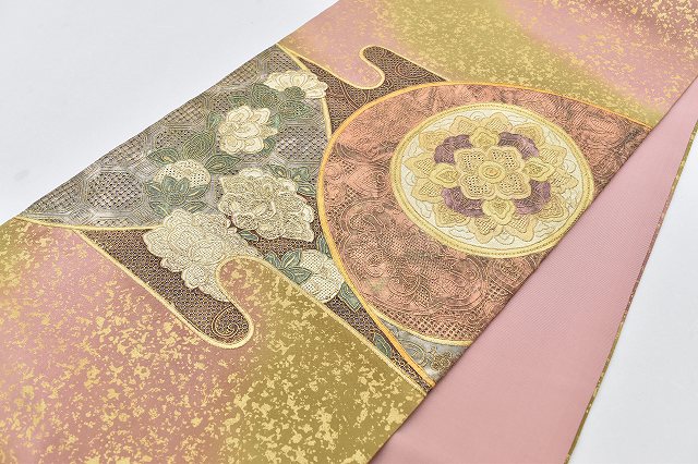 袋帯 リサイクル 正絹 フォーマル 礼装用 絹 化繊 仕立て上がり たたき染め スワトウ刺繍 緑 ピンク 金系 rr0385b 【 送料無料 リユース 和服 結婚式 お祝い お茶会 パーティー 入学式 卒業式 お茶会 お茶席 茶道 着物 帯 kimono 通販 】